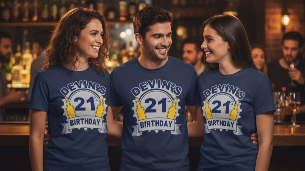 Custom 21st birthday shirts bring fun and personality to the big milestone. Create shirts for bar crawls, house parties, night events, destination trips, brunch outings, and group celebrations. Add inside jokes, drink graphics, or personalized messages to build a look that makes your birthday standout.