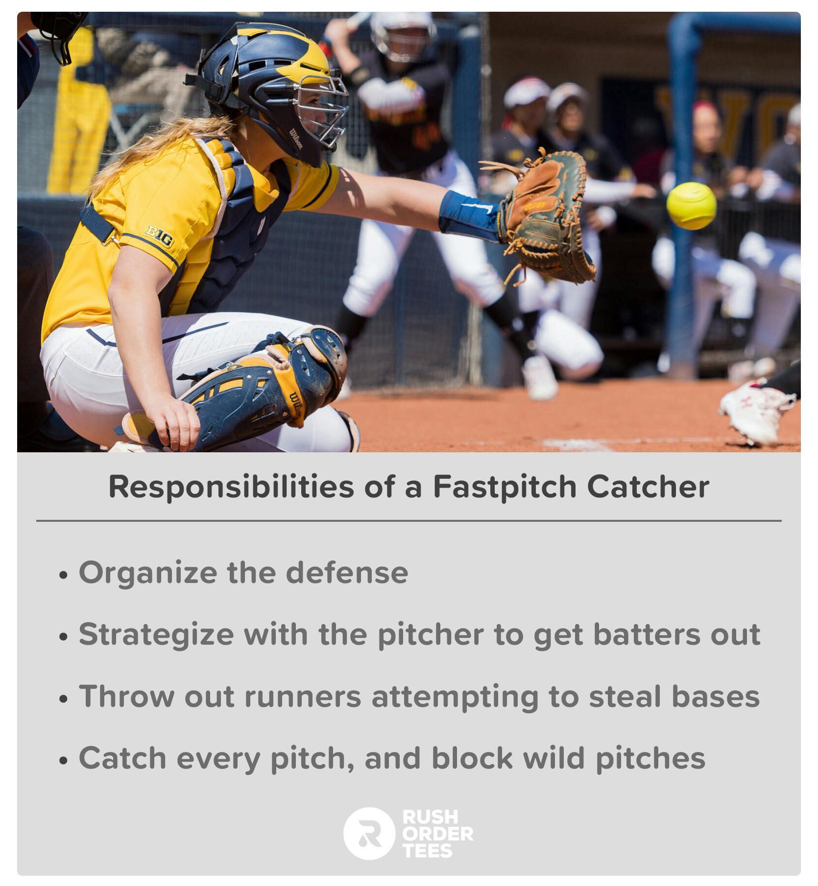 By contrast, the catcher is one of the most involved players in fastpitch softball. They are required to position the defense to best cover the player at-bat, communicate with the pitcher about what type of pitch to throw, and throw out runners attempting to steal bases. They also have to wear extensive protective gear that allows them to stay safe from foul-tips and balls that bounce in the dirt, along with a glove that can protect their hand from the speed of the pitch.
