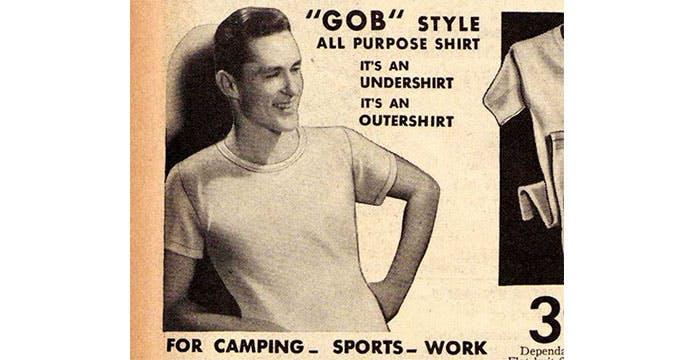 In 1938, Sears launched their own version of the early t-shirt which they called a gob shirt. It was similar to a modern plain t-shirt, and could be worn as undergarment, as well as an outer garment.