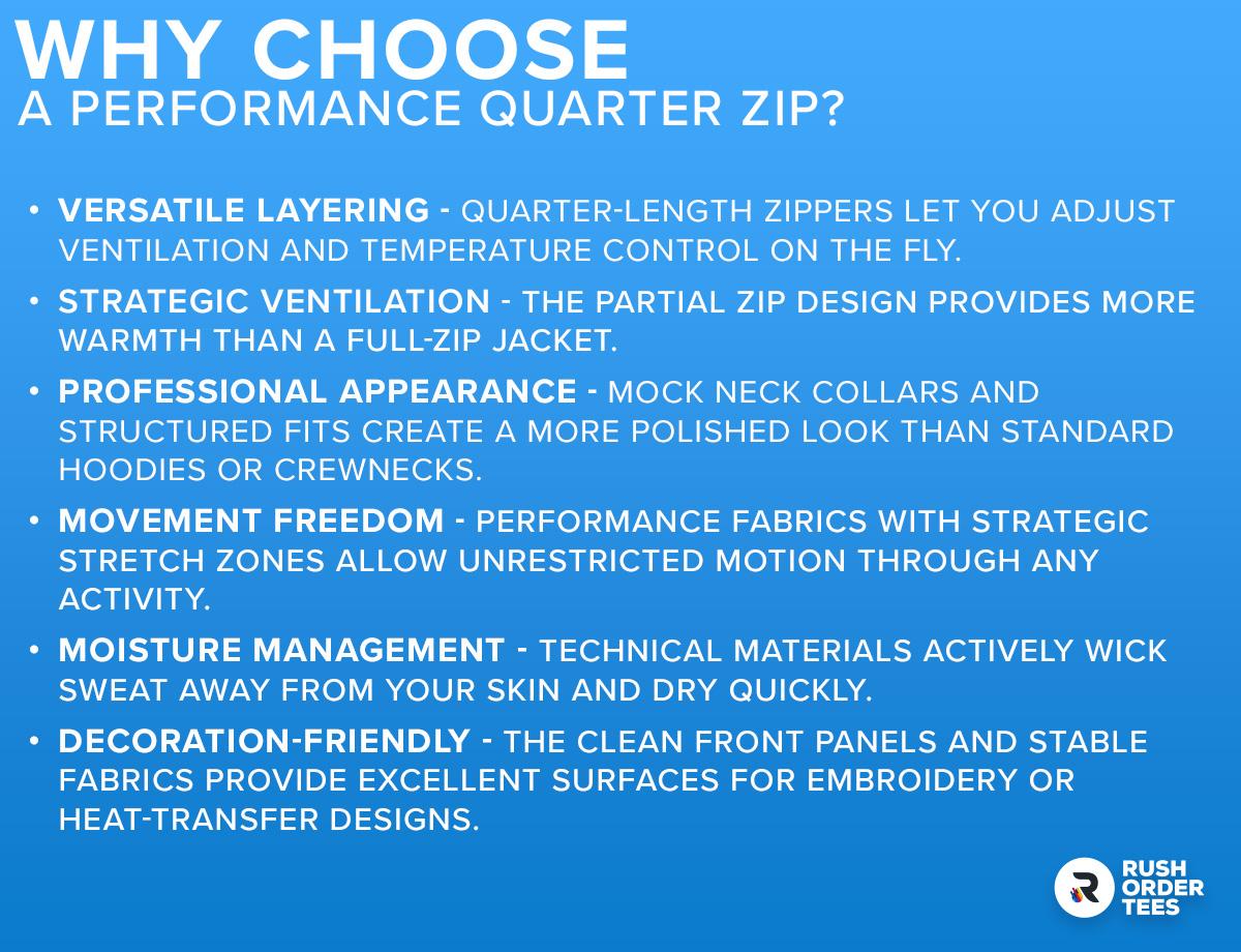 We've selected six standout styles across different price points - four premium options that showcase innovative performance features, plus moderate and budget picks that deliver reliable quality. Each recommendation includes practical customization tips based on our experience decorating thousands of quarter zips. Whether you're outfitting a corporate sales team or creating merch for your fitness studio, these proven performers consistently rank among our most popular styles.