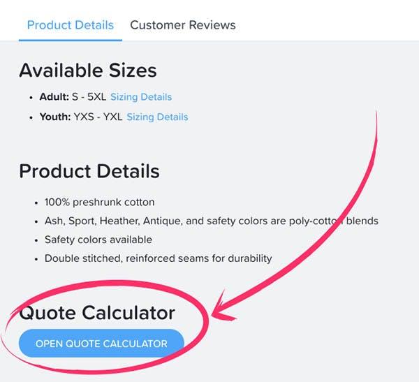 Pro tip: If you don’t have your artwork ready yet, you can still see how the charges work in our pricing calculator. Choose a product from our catalog and on the product page scroll down to the button that says “Quote Calculator” and choose your quantity and number of colors. This will provide your cost per item and show you the nearest price breaks without having to upload your artwork.