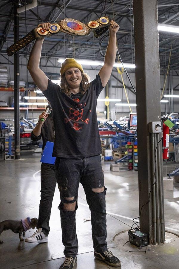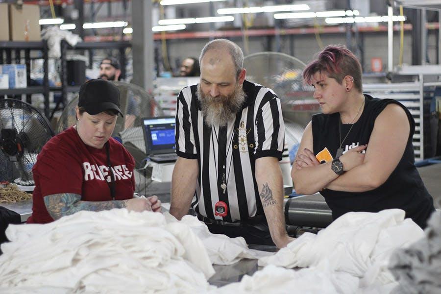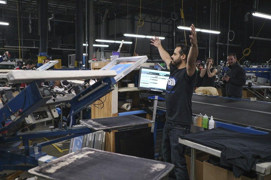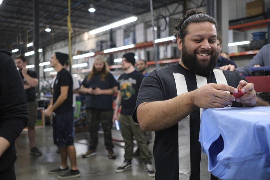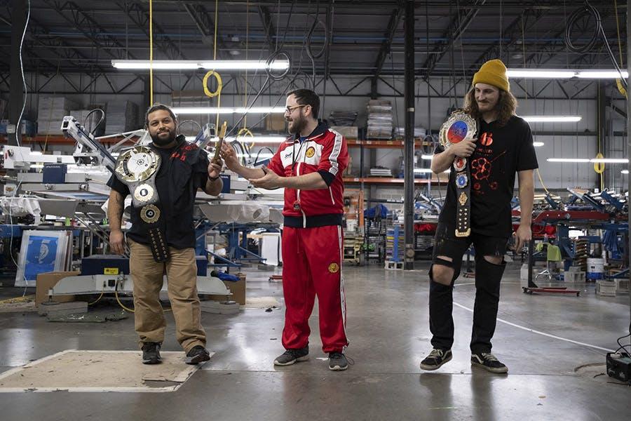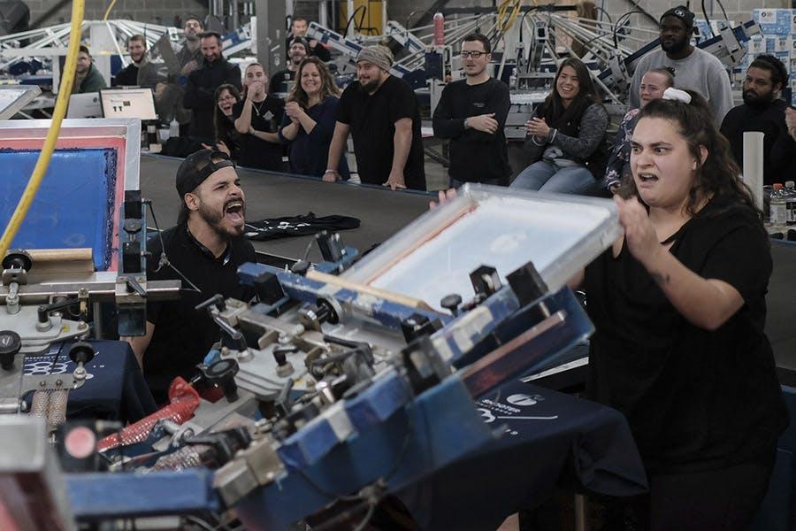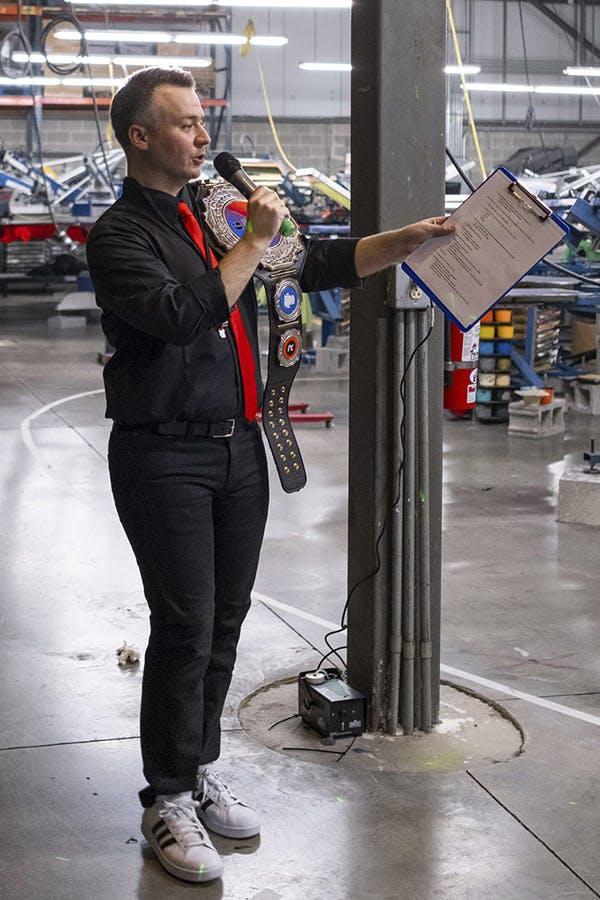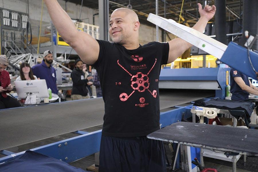 Six Shooter is RushOrderTees’ annual screen printing contest, a tournament-style competition among our employees that takes place over the course of six weeks. Each Friday afternoon is another round, and employees gather on the production floor to witness the action and cheer on the competitors. The winner of the tournament gets a championship belt, bragging rights, and if they win the whole thing, the coveted Golden Squeegee.