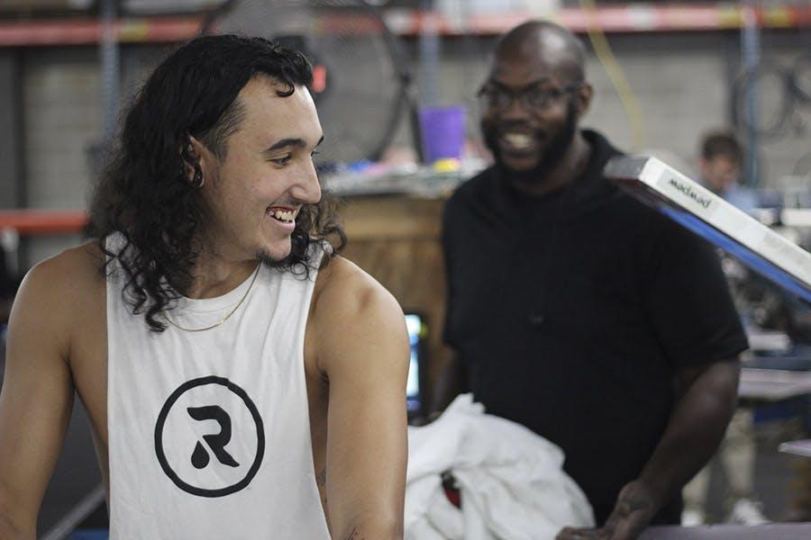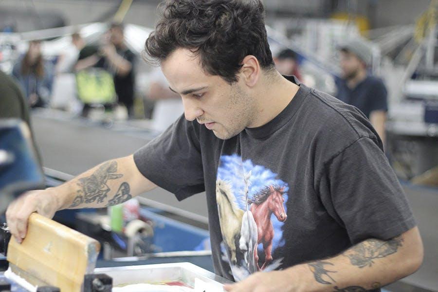 All the printers helped set up the screens, grabbed the ink, helped each other out. Helped the new guys who had never printed a day. There were about 5 people this year who literally never printed. So when they walk up there they had no idea what to do [laughing]. Someone was telling them moments before, “oh wait, you gotta ink up your screen, you gotta pull the squeegee this way– it was pretty intense.”