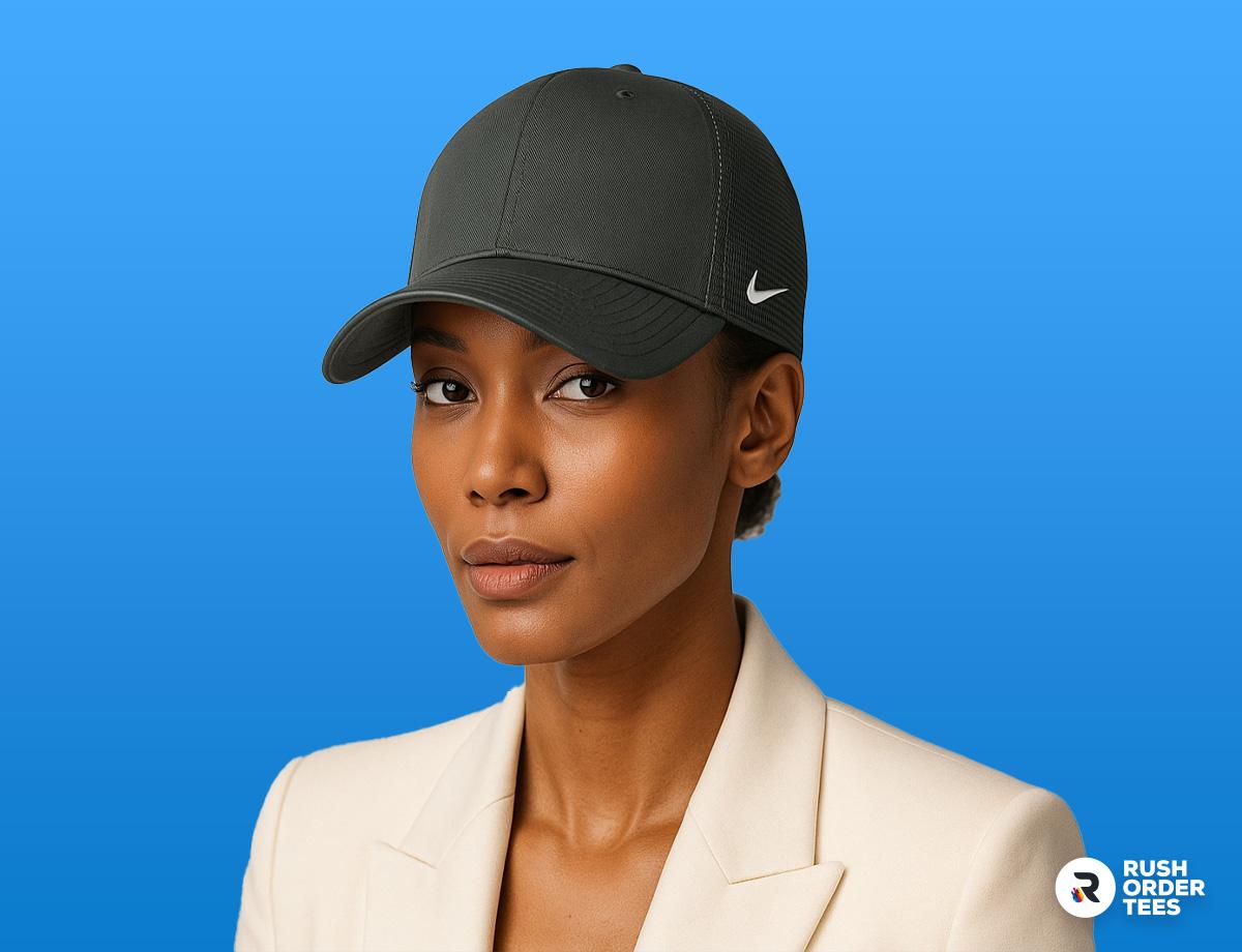 Why We Love It: Need help picking a custom hat? This one combines a classic trucker hat silhouette with modern, athletic fit. Its breathable mesh back panels improve ventilation, and the structured, mid-profile design with adjustable snapback closure ensure a comfortable fit for just about any head size, making this custom Nike hat a solid option for rounding out branded athletic ensembles.