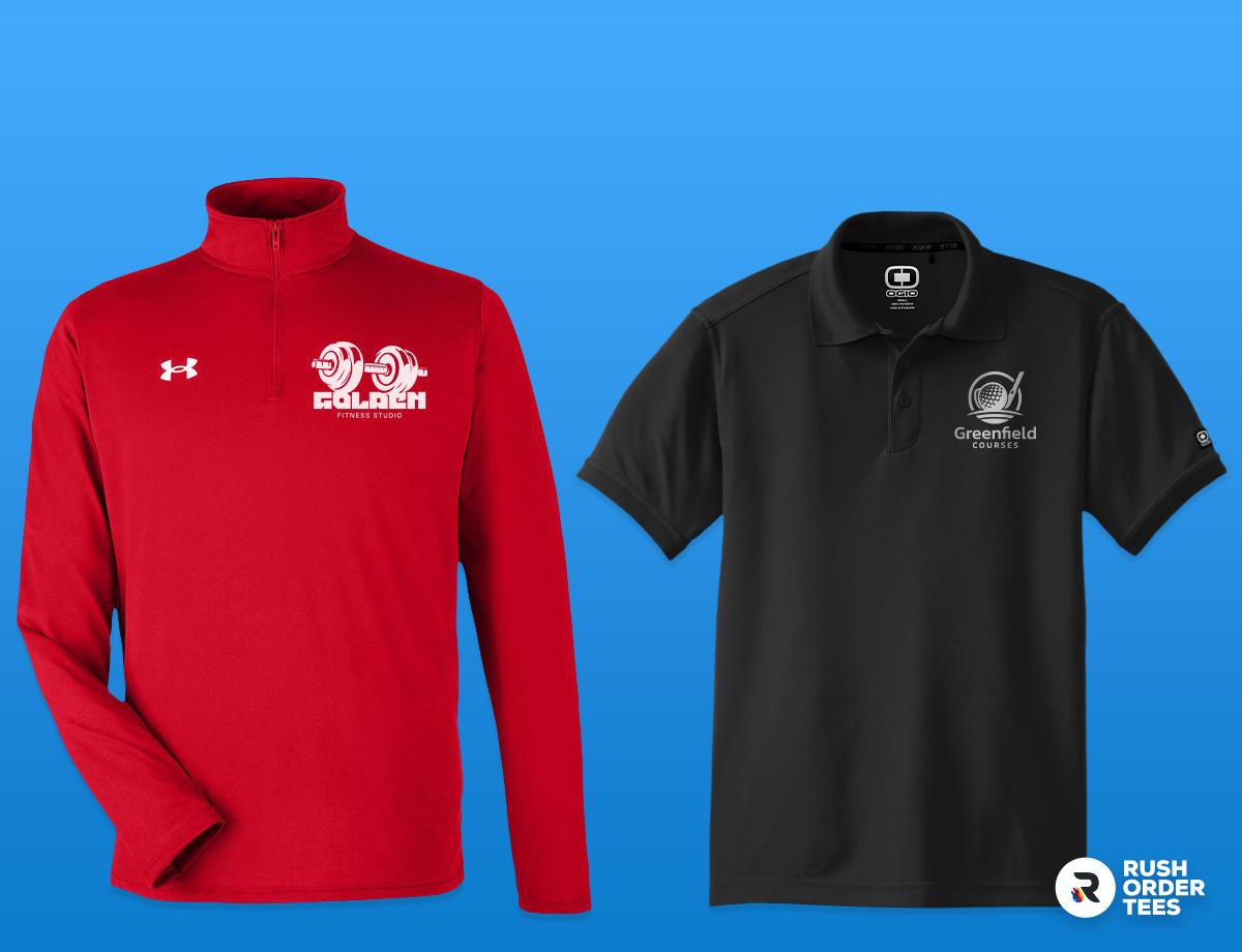 Both offer front and back printing, while Under Armour does force your chest design to compete with its own logo below the collar.