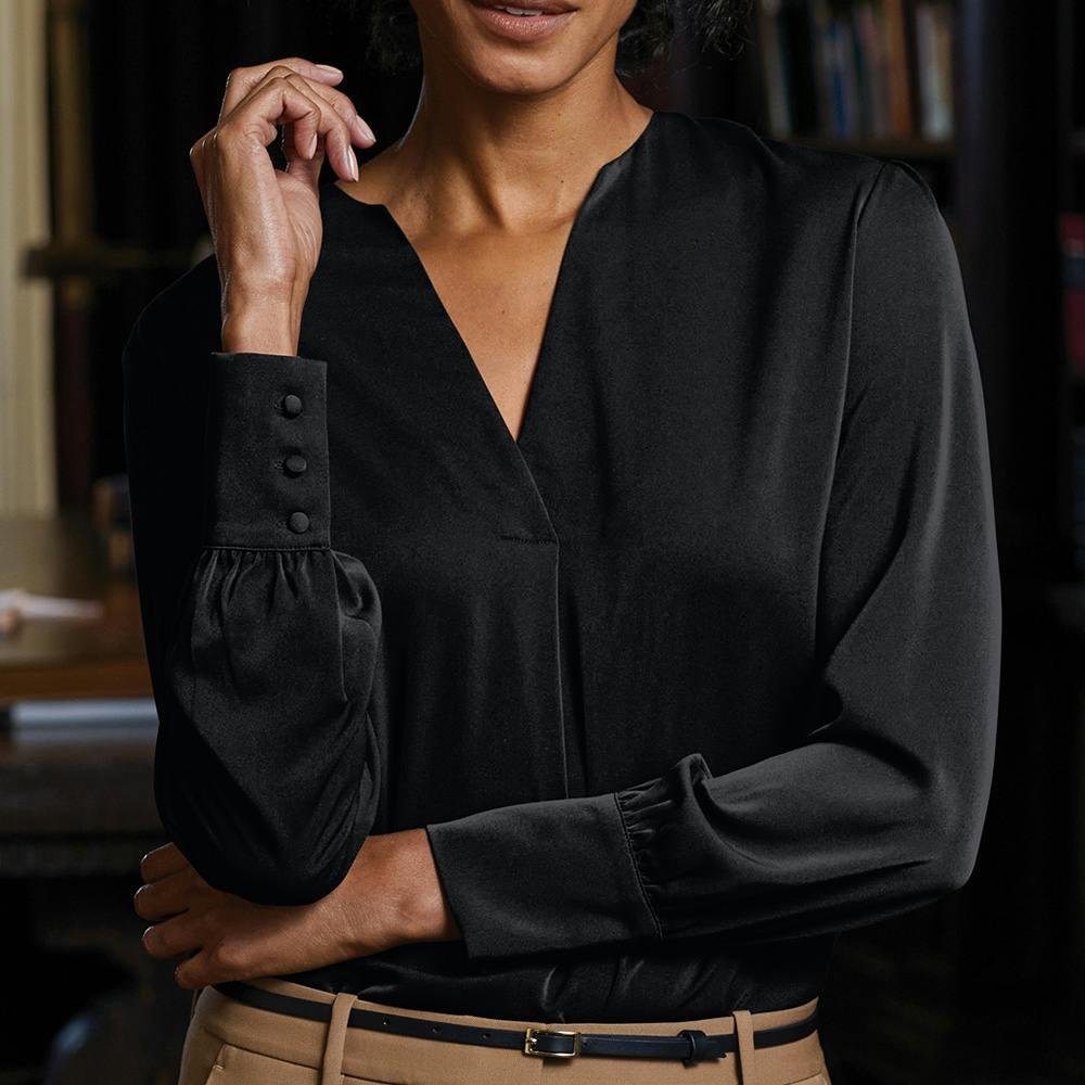 The soft satin fabric of this versatile blouse has a subtle sheen, lending an elegant look to any outfit. Designed for an easy fit to keep you feeling confident and comfortable.