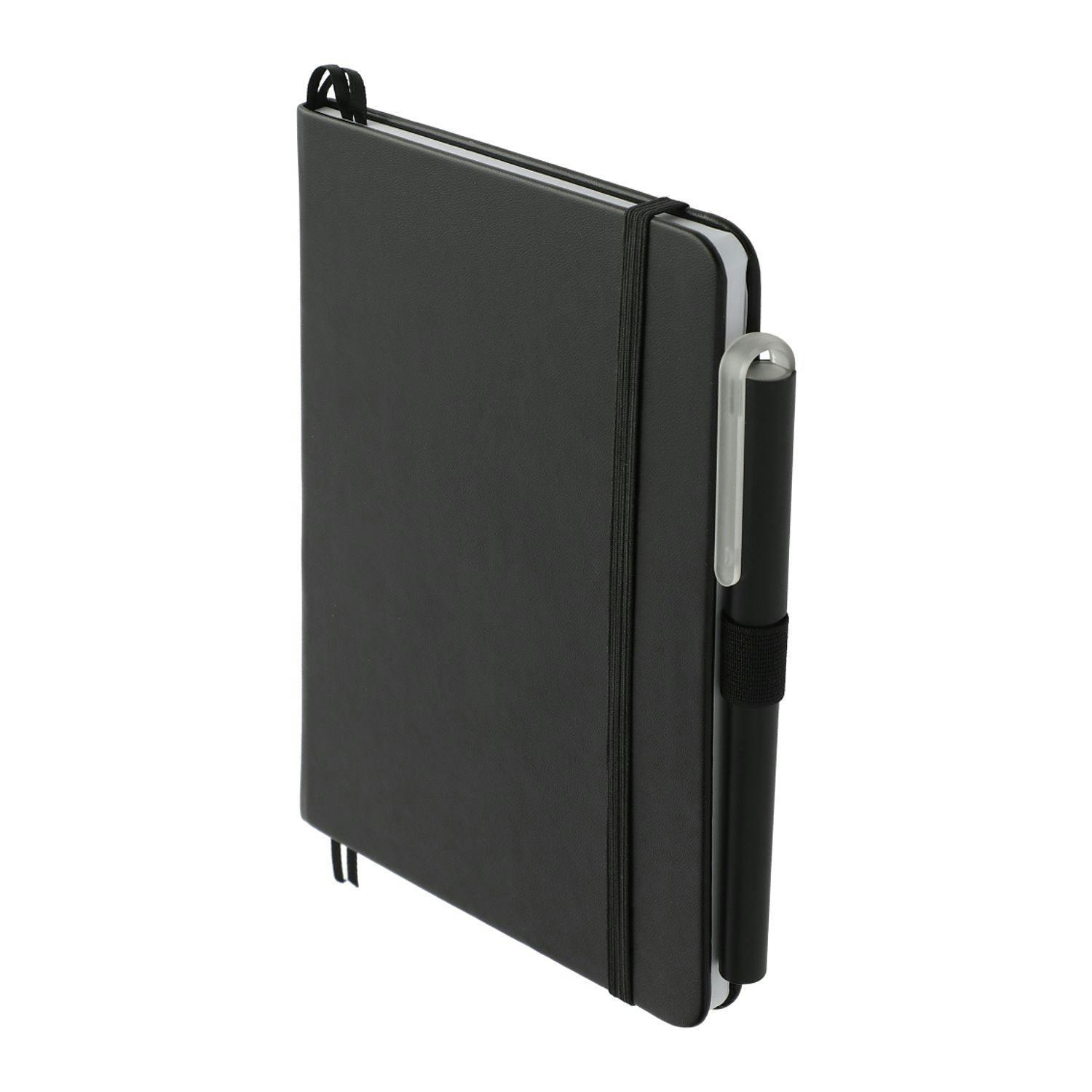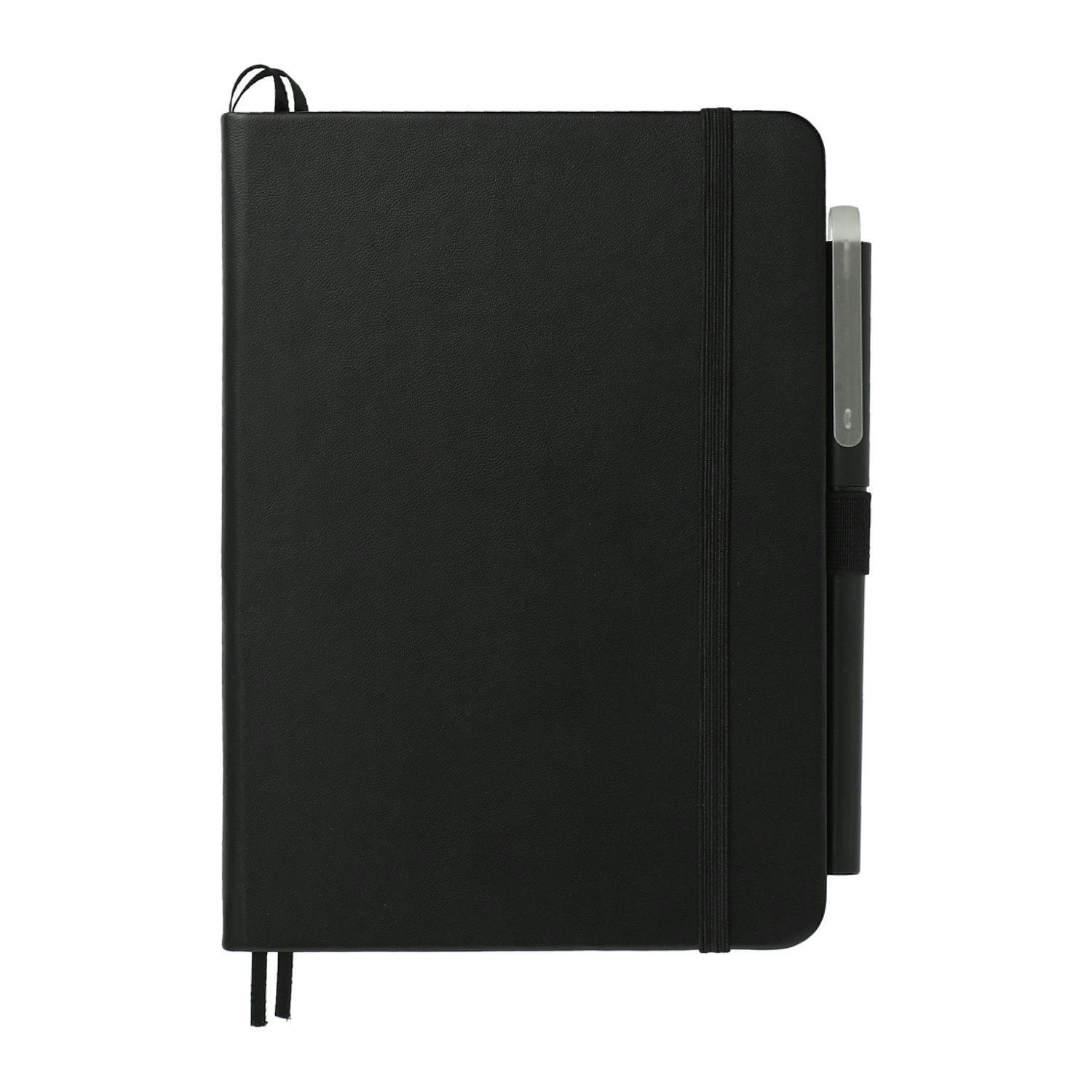 The 5" x 7" Bulleting Notebook with Pen Set features a recycled PU cover. 40% recycled post-consumer polyester, 18% recycled pre-consumer polyurethane, 18% polyurethane, 14% calcium carbonate. Includes 80 sheets of dotted white paper, two black ribbon markers, black pen loop and elastic closure. This notebook comes with a RPET pen with black ink. Through a partnership with 1% For The Planet, one percent of sales of all EcoSmart® products are donated to environmental nonprofits.