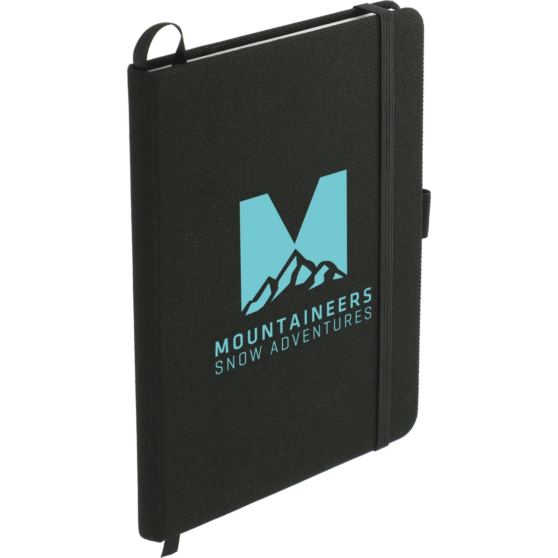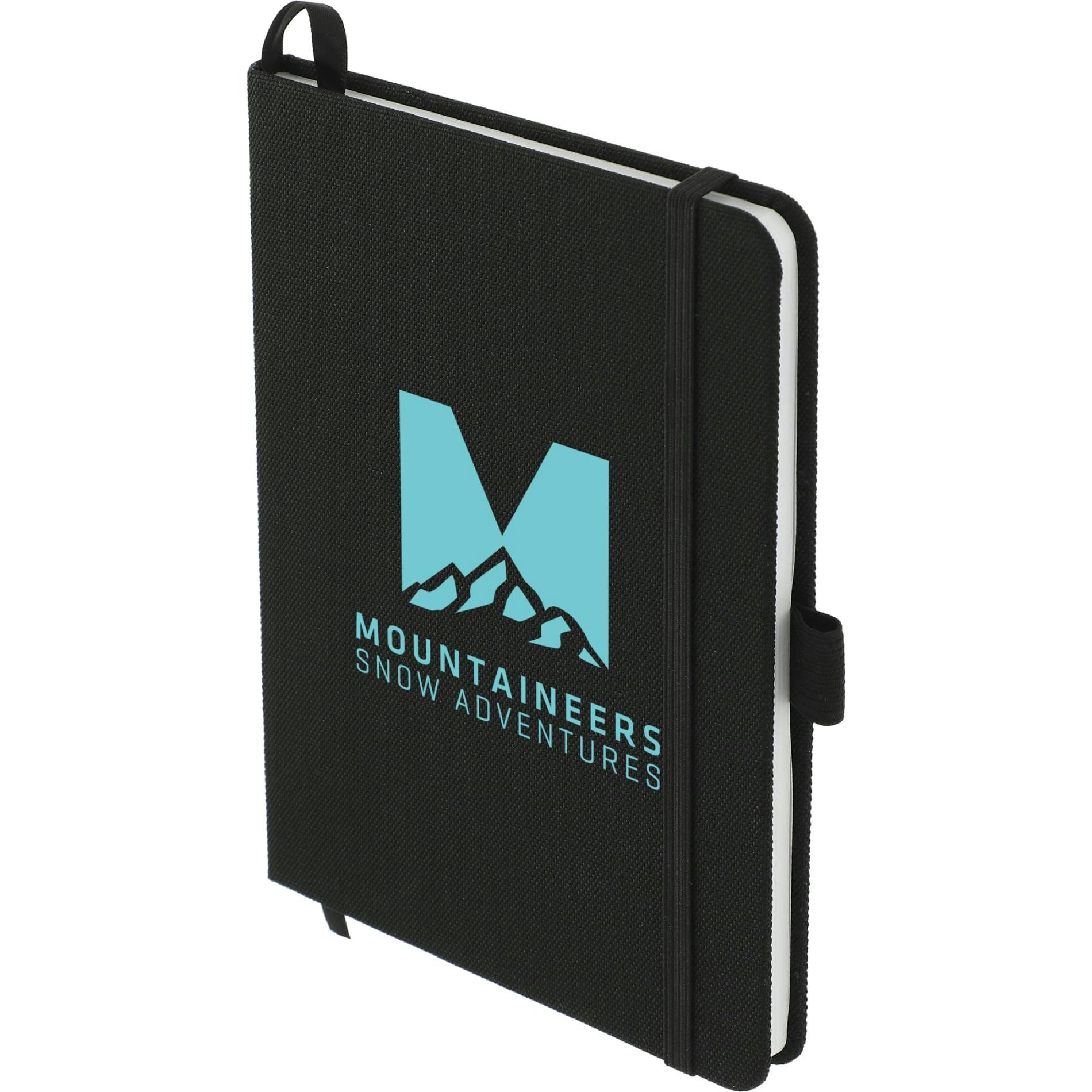 The 5" x 7" Recycled PET Bound Notebook features a 600D RPET hardcover with color matching elastic pen loop, closure, and ribbon page marker. 80 sheets of white, recycled lined paper.