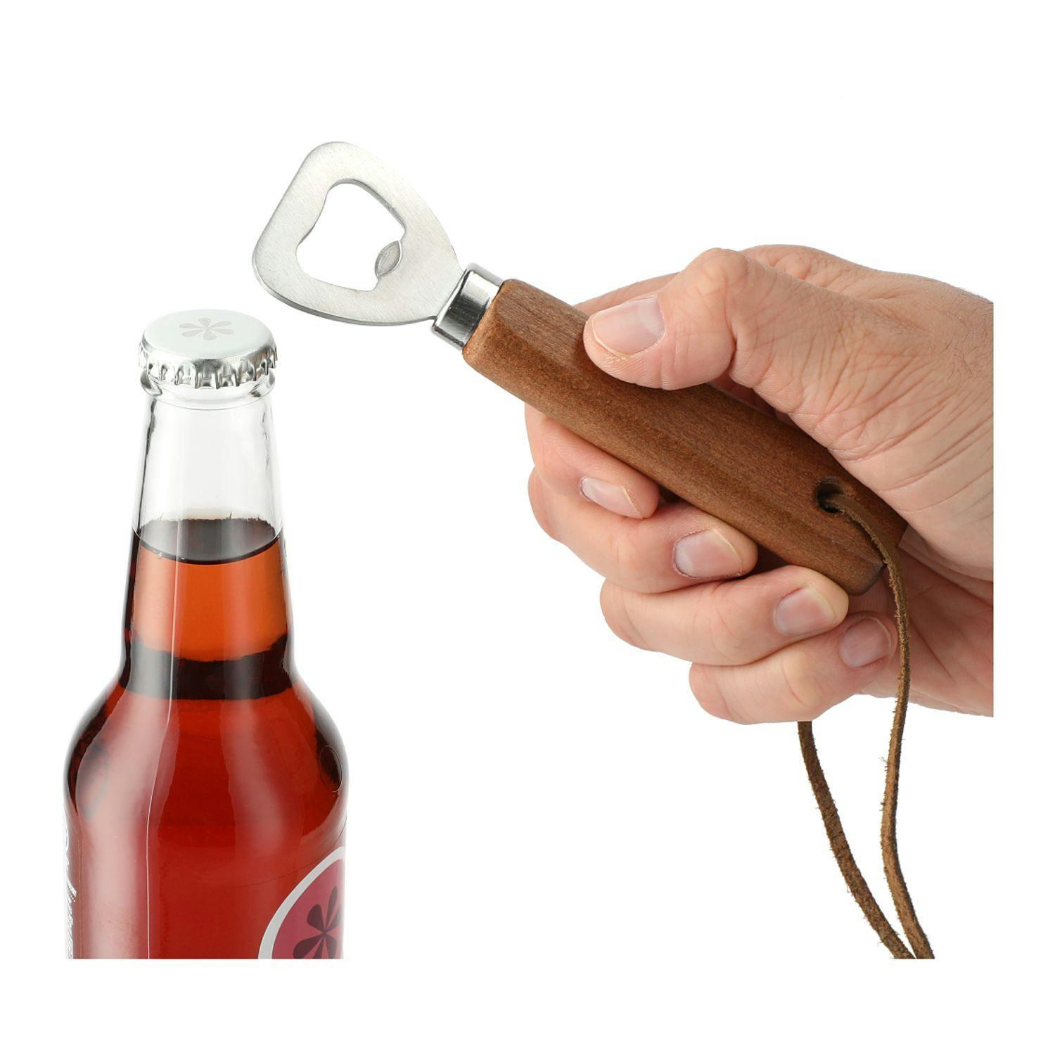 Wood Handle bottle opener with leather wrist strap. Hop on the Bull. Craft up the night. Live Classy. Open your drinks in style.