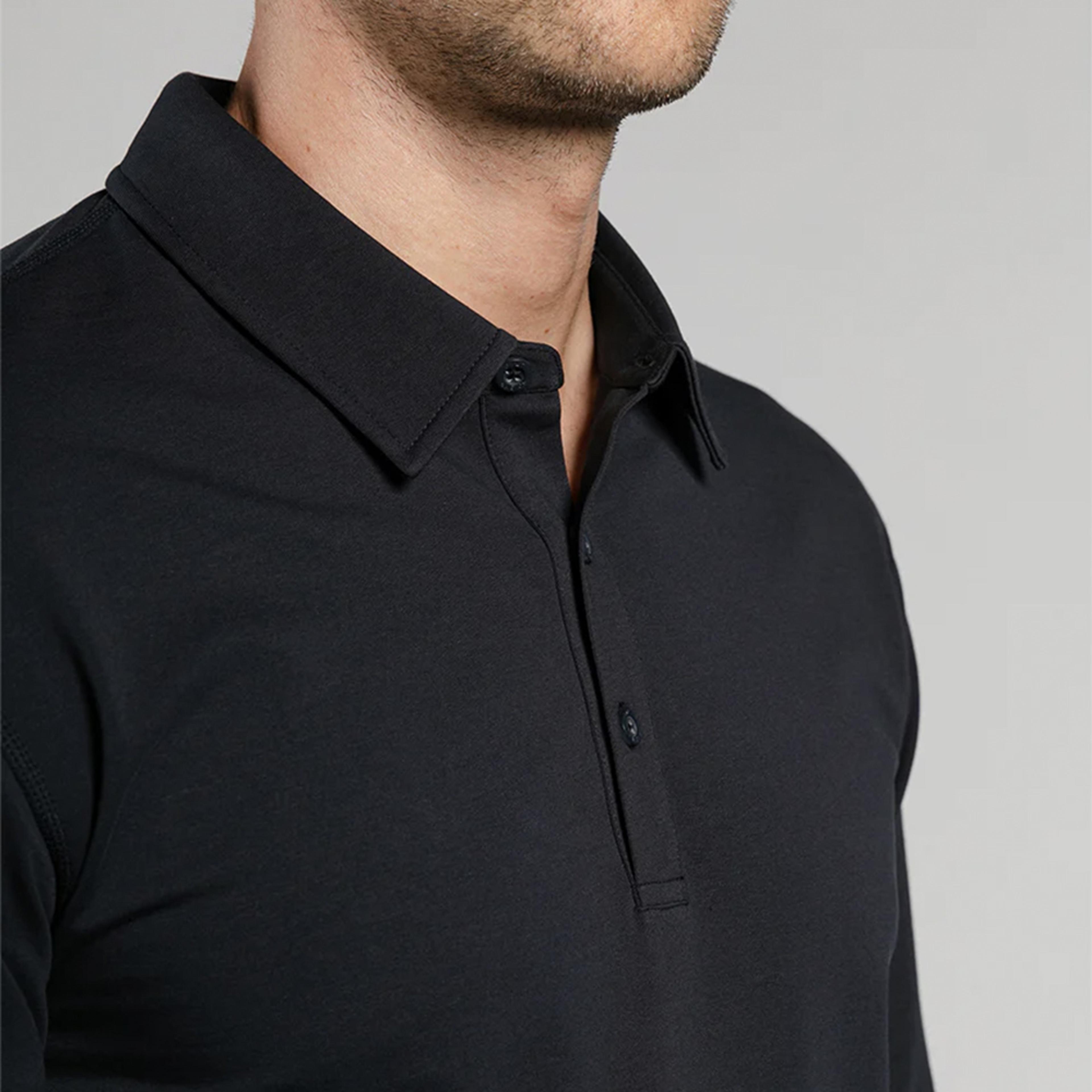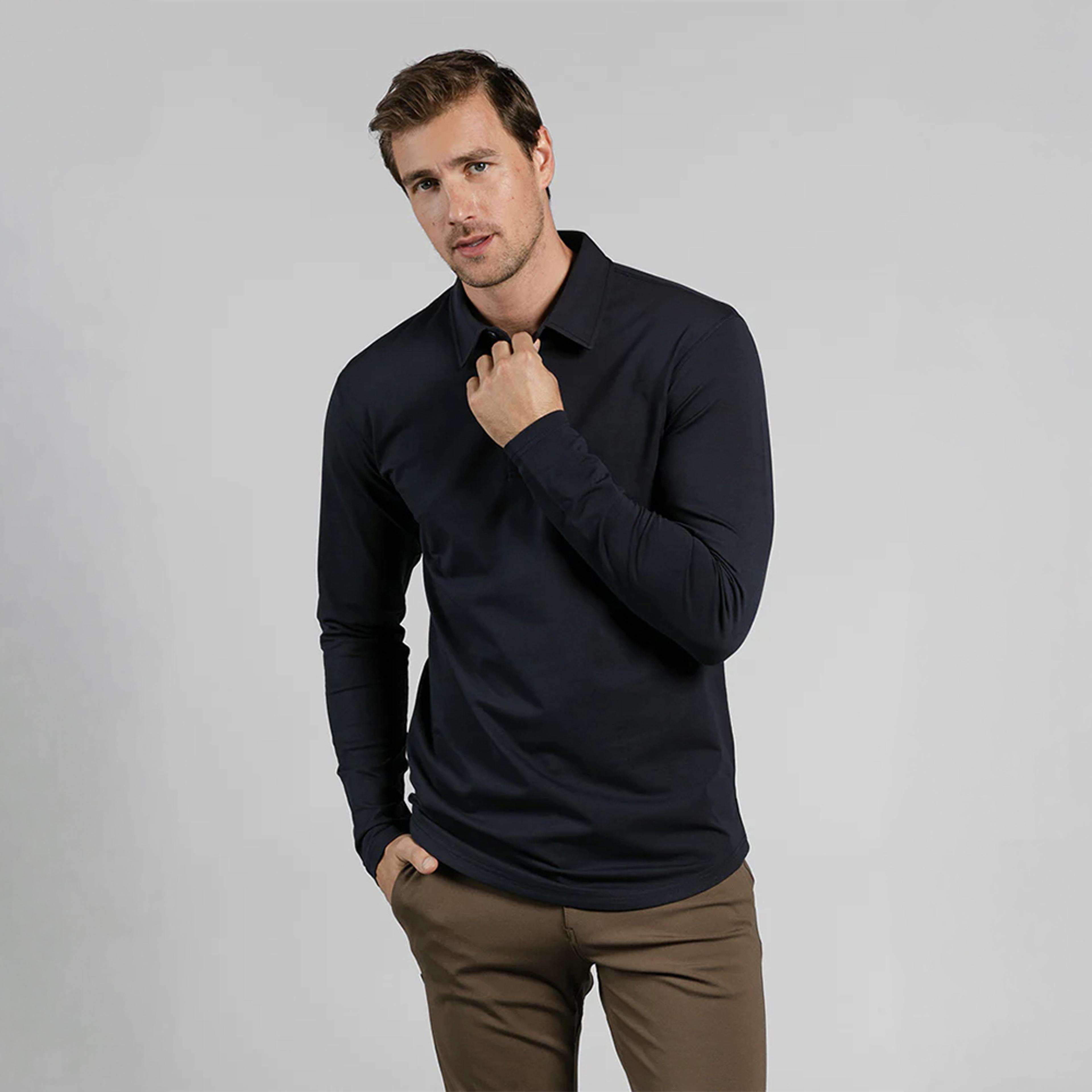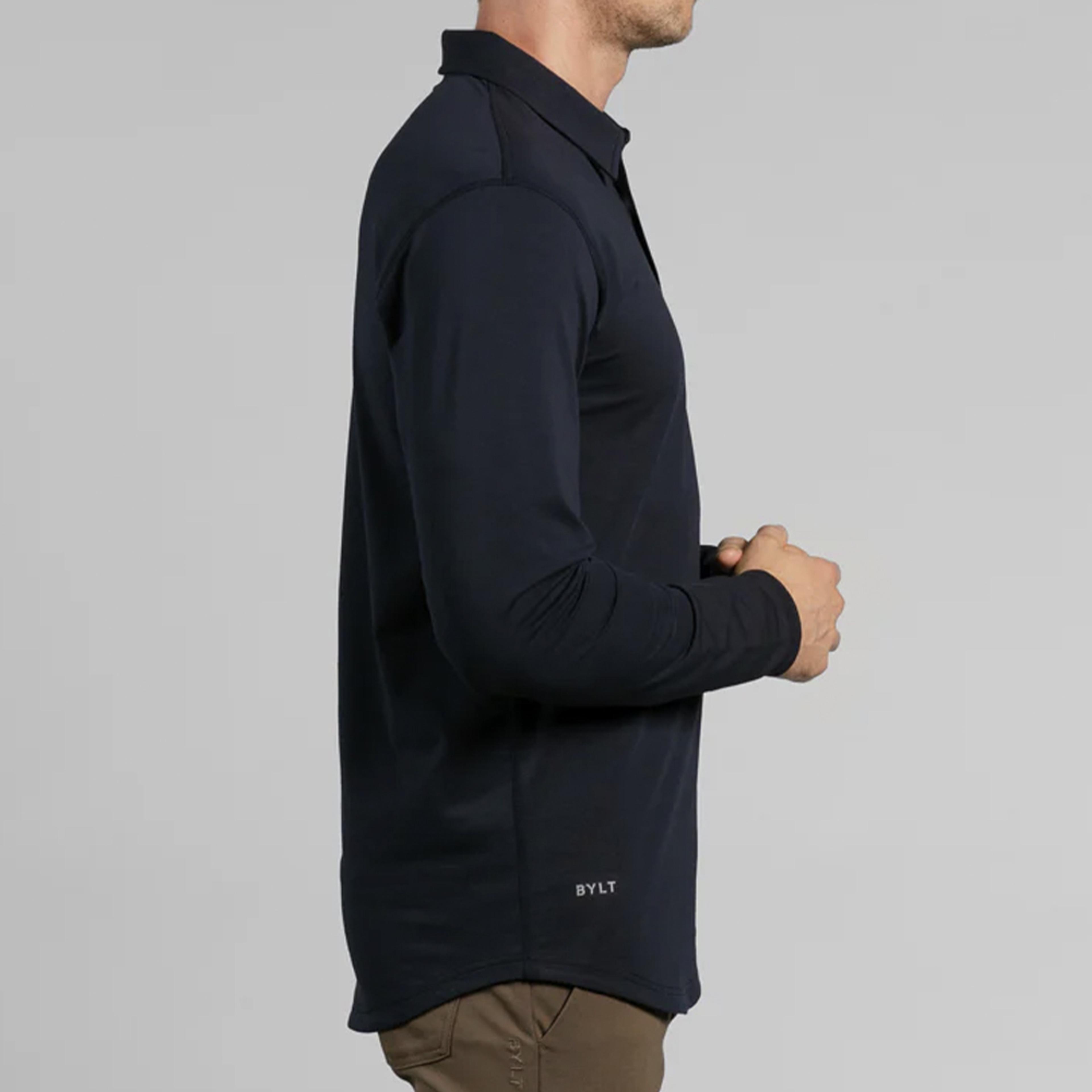 Refined, modern, and built for all-day performance, the BYLT Drop-Cut Long Sleeve LUX Polo delivers elevated style with everyday comfort. Made from premium LUX fabric, this men’s long sleeve polo features a smooth hand feel, structured drape, and 4-way stretch that moves with you while maintaining a sharp, polished look. The slim fit and signature drop-cut hem create a sleek silhouette that stands out in any setting. Wrinkle-resistant and versatile, this performance polo is perfect for business casual wear, travel, events, or elevated everyday outfits. Wear it on its own or layered for a clean, confident look from morning to night.