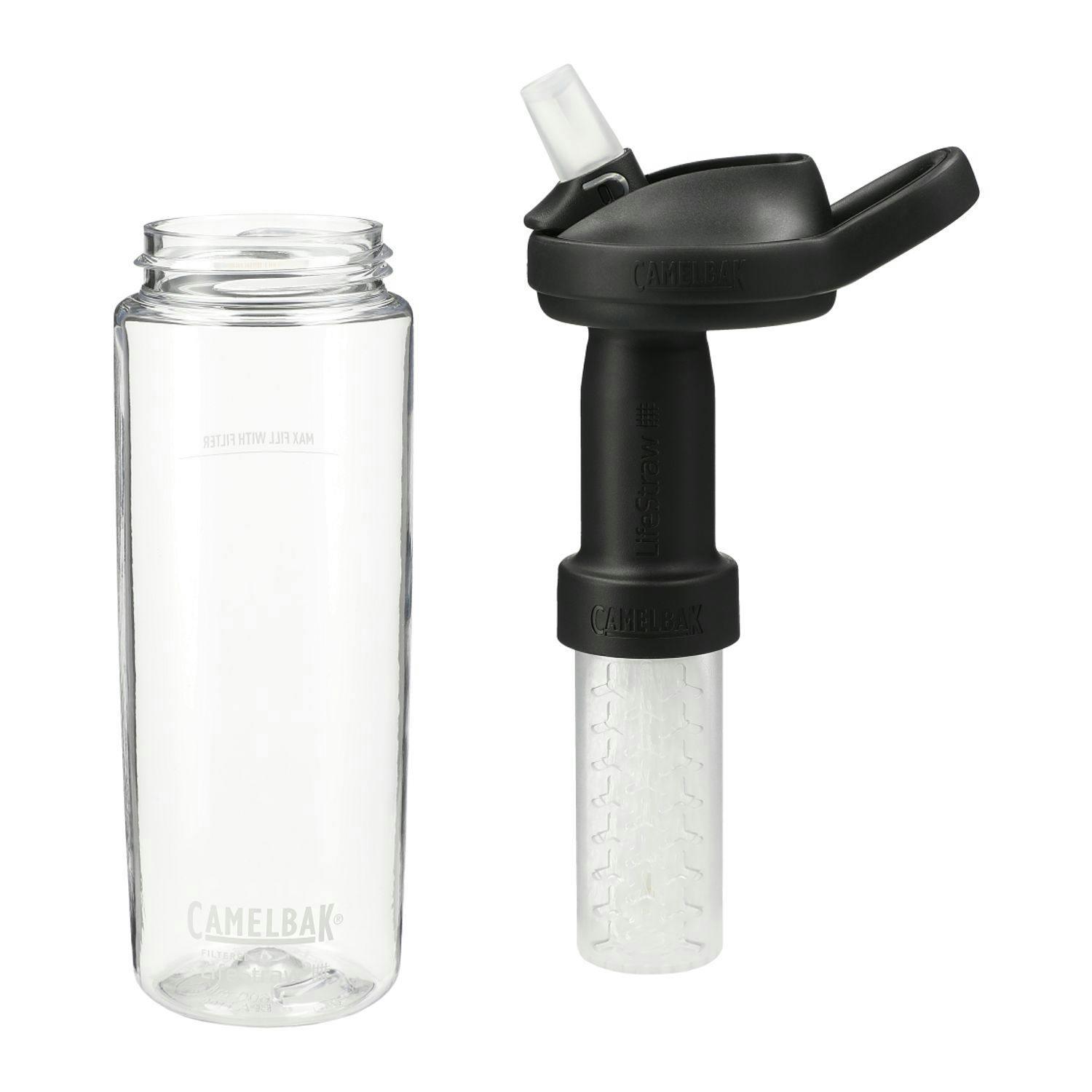 The CamelBak® eddy®+ 20oz w/ Tritan™ RENEW water bottle is made from Eastman Tritan™ RENEW, a durable and sustainable material containing 50% recycled plastic. The water bottle is shatter-, stain- and odor-resistant, and its wide mouth makes it easy to fill or clean. Enjoy spill-proof sipping at work or on the trail thanks to the screw-on lid with a bite valve and one-finger carry handle. This 20oz eddy®+ water bottle features the built-in LifeStraw, which gives adventurers the convenience of home hydration wherever they roam. The LifeStraw Filter includes the Ion Exchange Filter and the Hollow Fiber Filter. BPA-free.