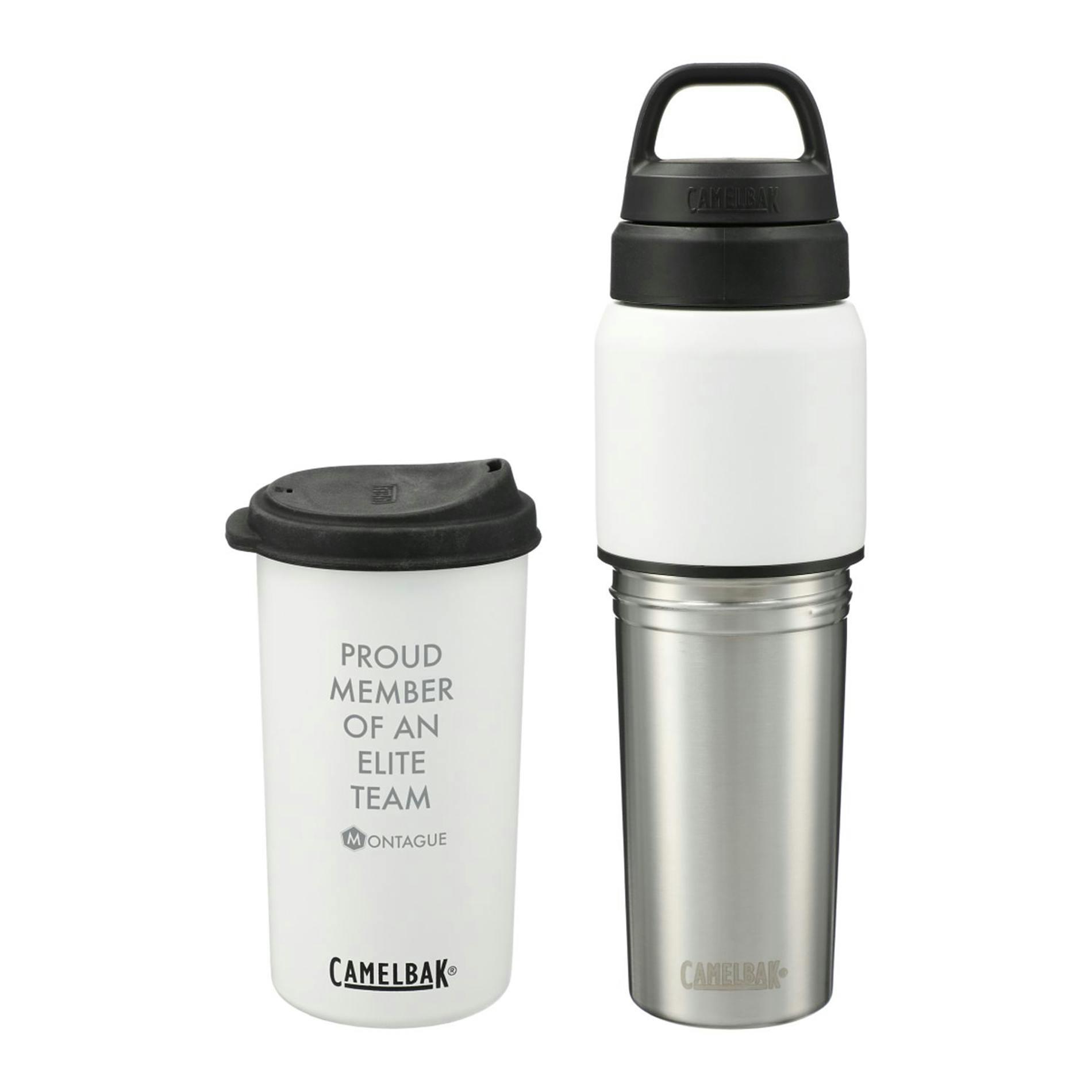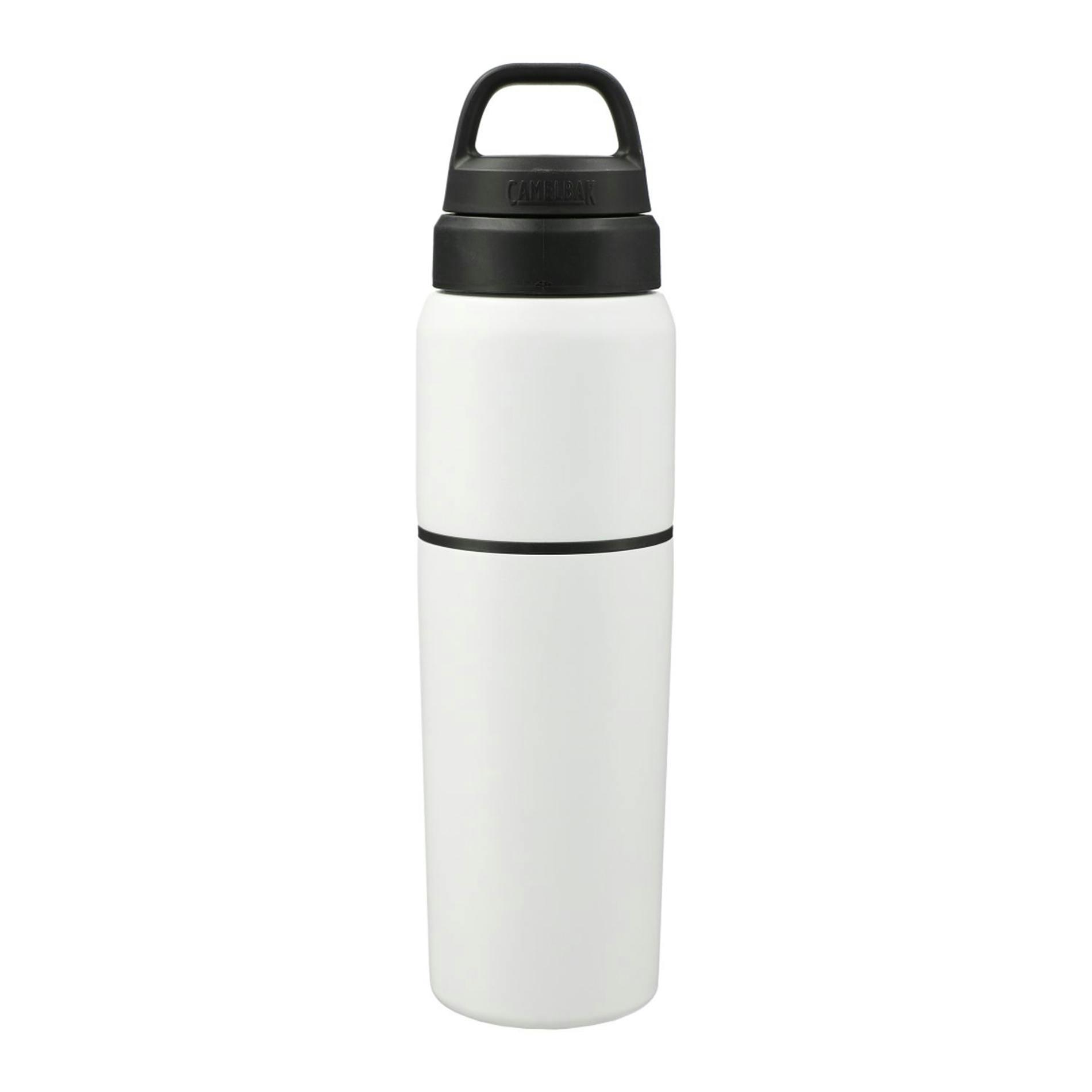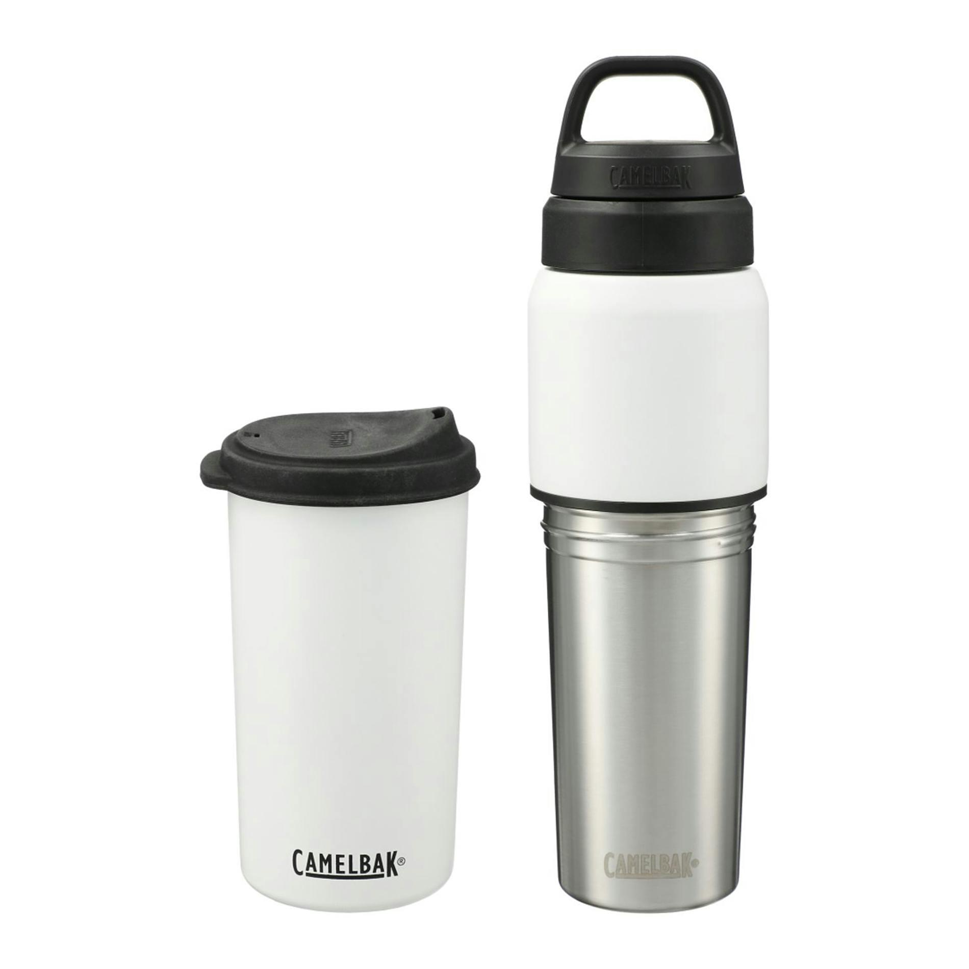 The CamelBak® MultiBev 22oz Bottle / 16oz Cup is versatile, sustainable, and perfect for on the go. This 2-in-1 vessel serves as both a water bottle and a detachable travel cup for convenient carrying. Use it for coffee in the morning, water throughout the day, and camp-out beers with friends at night. Drink. Share. Rinse and repeat. Double-wall vacuum-insulated stainless steel keeps beverages hot or cold for hours. A powder-coat finish and non-slip silicone base create a highly durable exterior. The leak-proof Pak™ Cap tucks the Roll and Fold Lid neatly out of sight until paired with the removable cup or stores small essentials like a tea bag or snacks. Easy-to-clean, dishwasher-safe design, and BPA-free. Feel good about choosing a sustainable solution to single-use plastics.