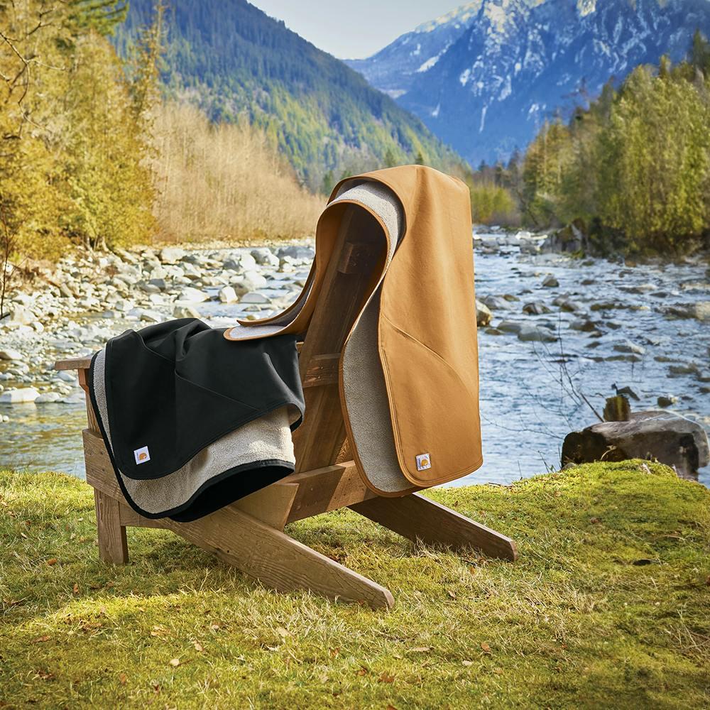 This Carhartt Firm Duck Sherpa-Lined Blanket is your go-to for outdoor adventures and leisurely gatherings. Crafted from durable ring spun cotton duck canvas, it's built to last. The plush Sherpa fleece lining adds a layer of warmth and comfort, making it perfect for various outdoor activities. Its water-repellent coating enhances durability, while reinforced bound edges ensure longevity. Additionally, it features a corner slip pocket for easy decoration access, and boasts authentic Carhartt labels sewn on both the firm duck slip pocket and sherpa-lined side corner. Customize your own with artwork or design.