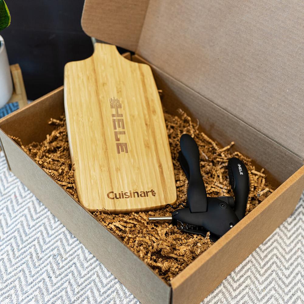 This custom set is perfect for gifting. It includes a Cuisinart 14" Bamboo Cutting Board and a Rabbit Original Corkscrew. Make your fellow wine and cheese enjoyers smile with this essential duo! Complete this custom set with your logo or design.