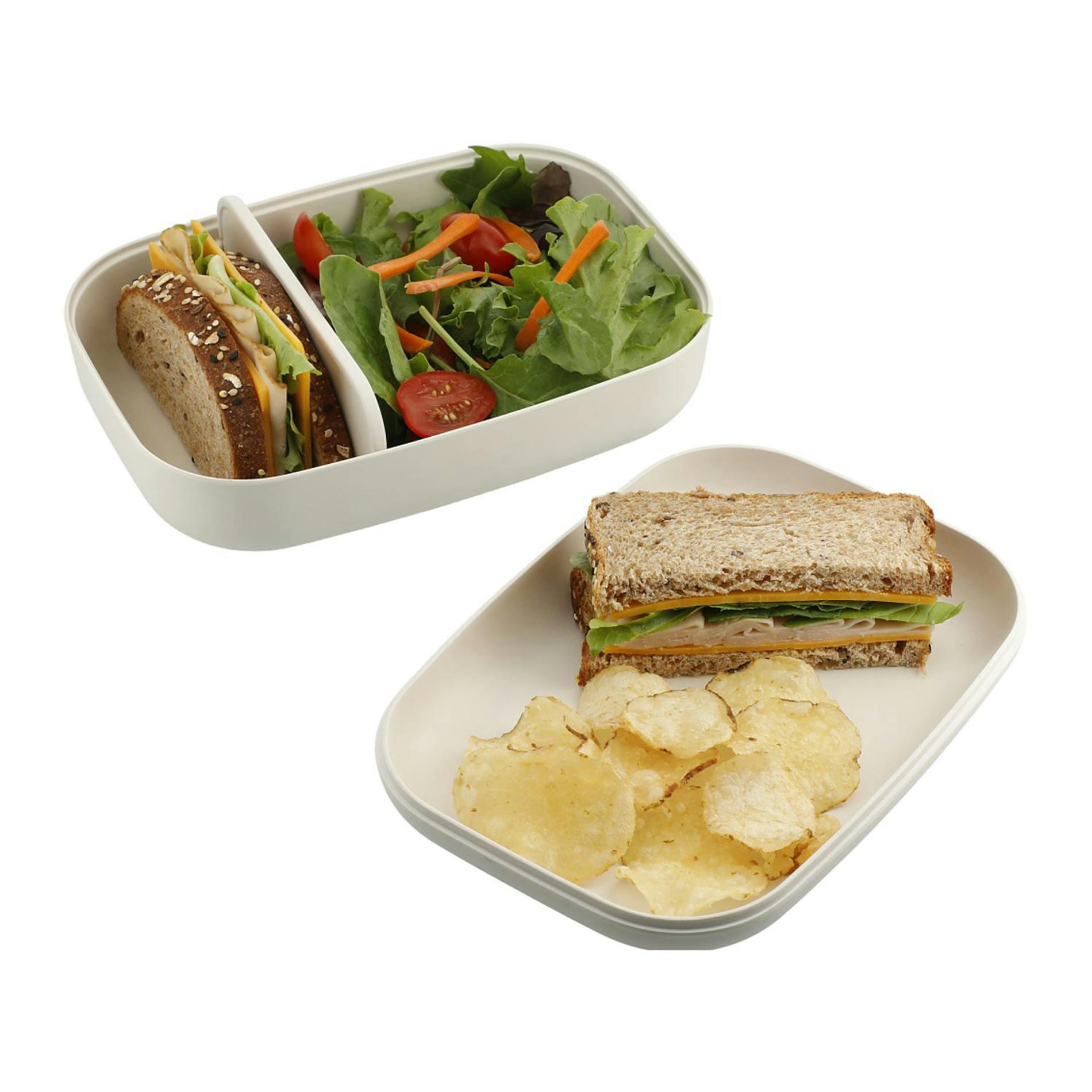 This FSC certified bamboo fiber bento box features a removeable divider and the lid doubles as a plate. This is the ultimate plastic baggie replacement!