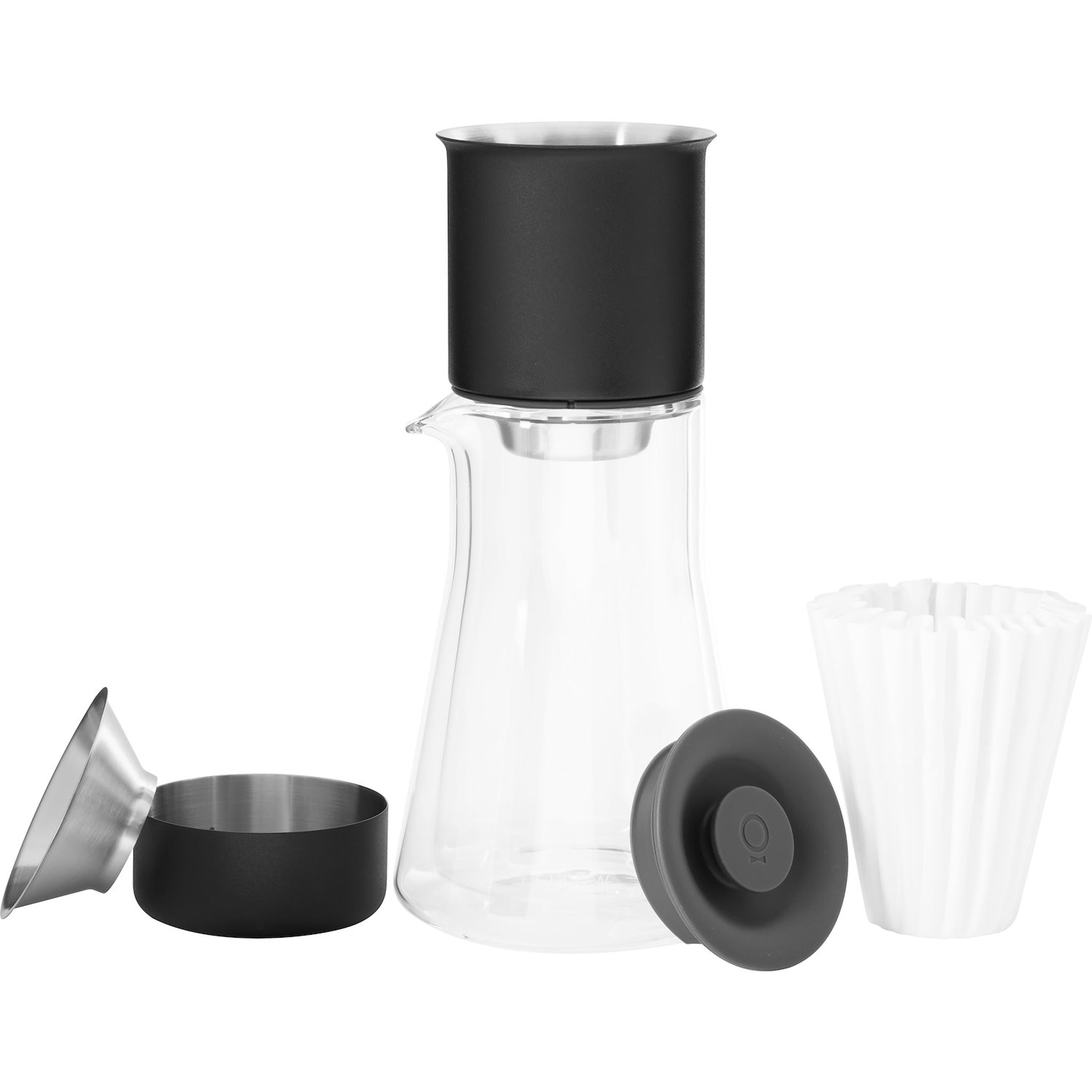 This 20 oz set features a double-wall glass carafe designed to maintain temperature while showcasing a clean, modern look. The stainless steel dripper allows for smooth, consistent brewing without the need for disposable filters. Built-in coffee-to-water measurement markings help ensure accurate, repeatable pours. A silicone lid is included for convenient storage, and the set comes packaged in a gift box.