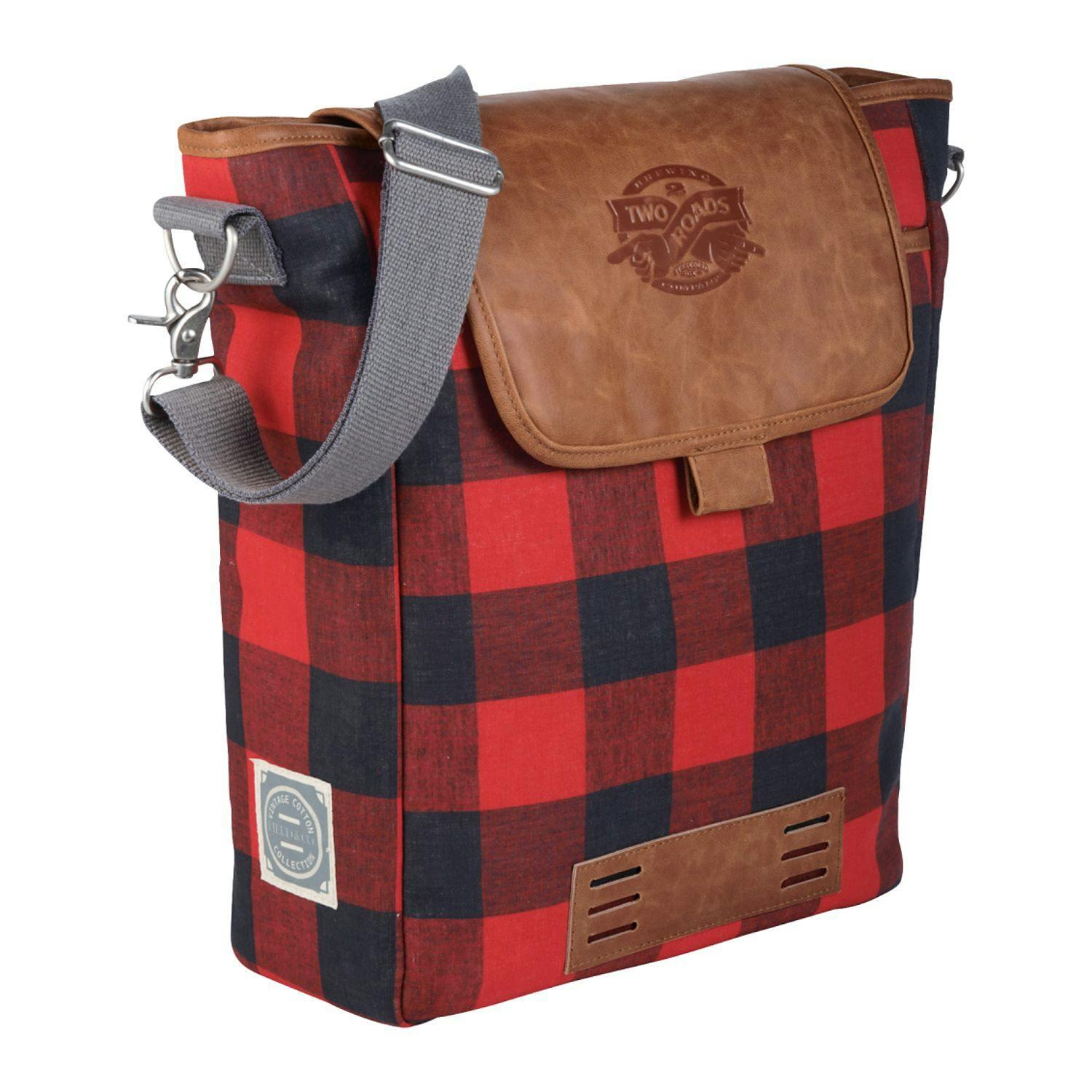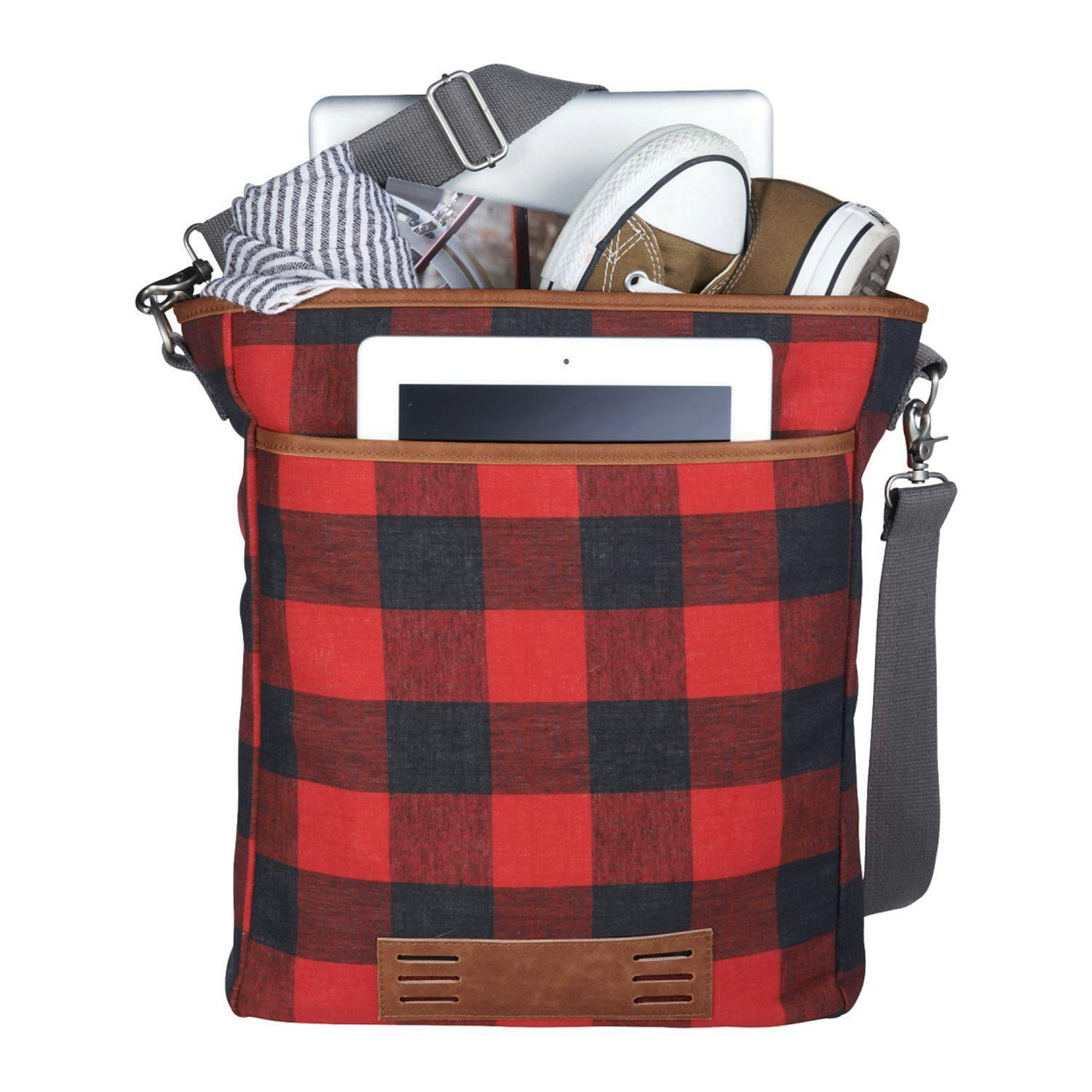 Part of the Field & Co.® Campster Series, inspiration was drawn from retro camping and old school scout looks combined with modern needs. Zippered main compartment with rustic, worn-in look, flap closure features a padded computer pocket that holds most 15" laptops. Fully lined with cotton ticking striped lining. Open front pocket is sized to fit most iPads, tablets, and eReaders in their cases. Cotton webbing carry strap is adjustable and removable with metal claw hardware, allowing for cross-body wear. Main body is constructed of 16 oz. cotton with popular buffalo check plaid. Unique Field & Co.® branding details like exterior cotton patch and interior stamp featuring the inspiration behind the collection.