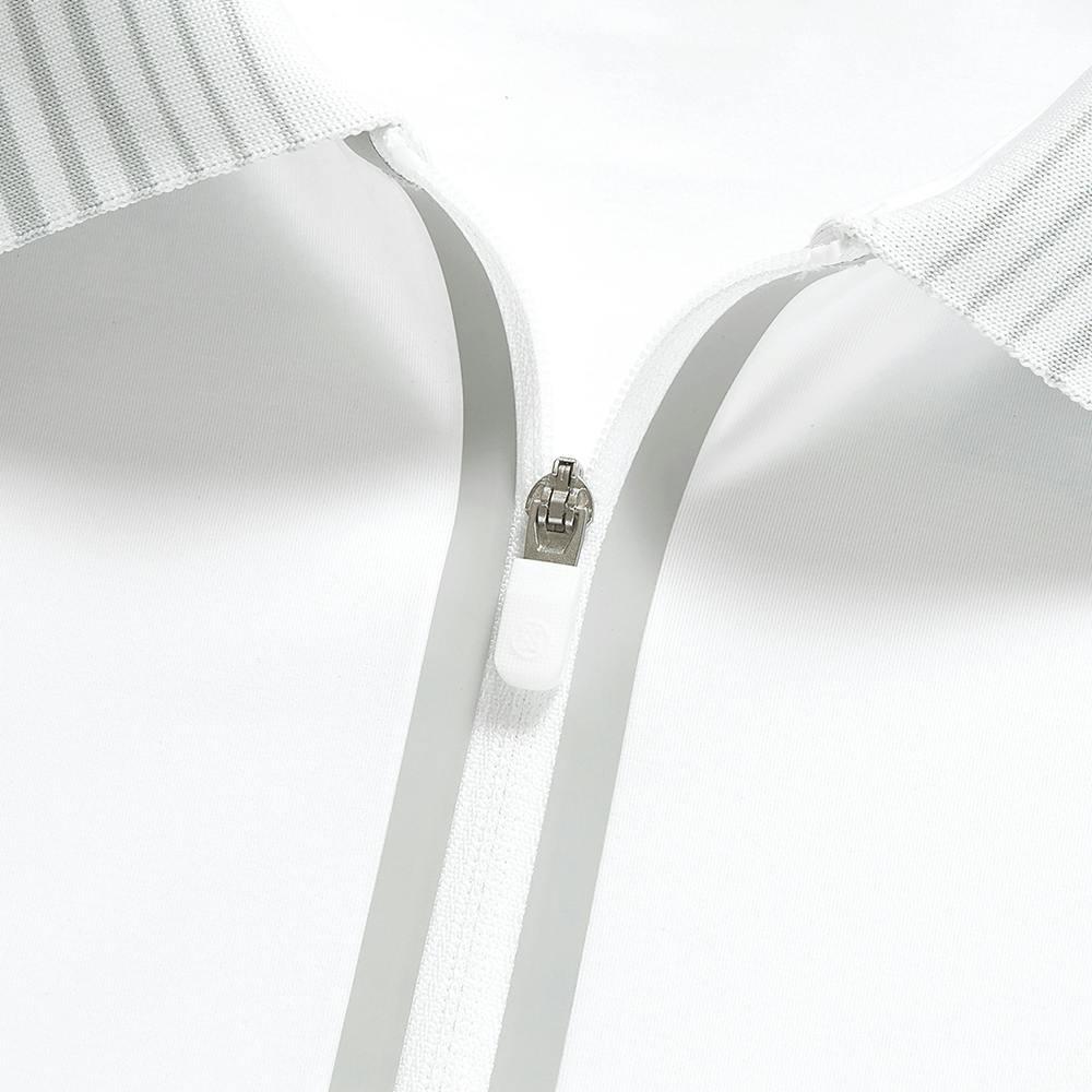 A best seller for many reasons. Retro fashion inspired with a gradient ribbed collar and unique quarter-zip taping embellishment makes this style a standout on the course. The stretchy, silky tech nylon fabric boasts performance properties for days and drapes elegantly on the body. Pair it with our Effortless Skort for a chic on-course look.