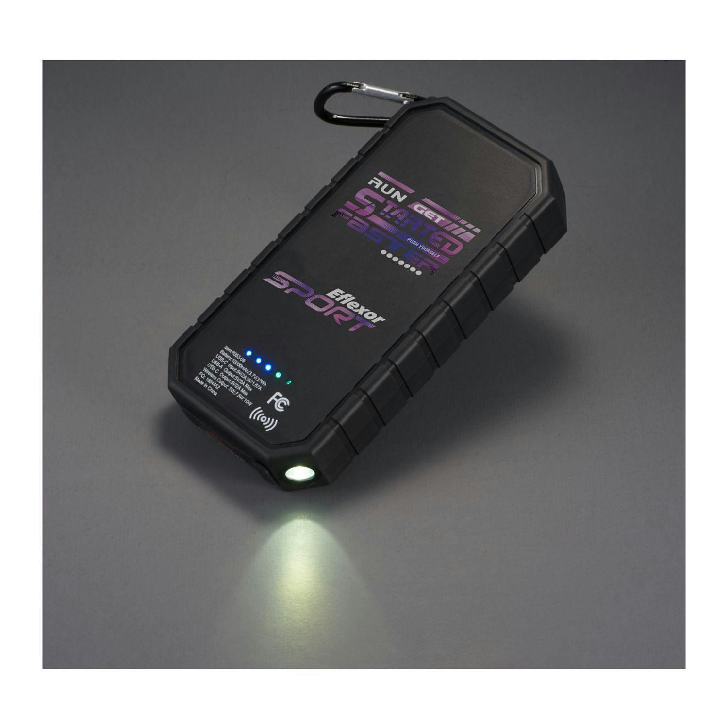 The High Sierra® IPX5 Solar Fast Wireless Power Bank has a 10,000 mAh rechargeable lithium polymer battery (37Wh) that works as a wireless charging pad or normal power bank. It has a solar panel, a built-in flashlight and a carabiner clip for easy carrying. IPX5 Waterproof. USB Output: 5V/2.4A; Type-C Output: 5V/2.4A. Supports three wireless charging modes: 7.5W for All iPhone 8/X/11/12/13 Series; 10W for Samsung Galaxy S9/S9 plus/S8/S8 Plus/Note 9/8 and more, and 5W standard charging for all enabled devices. To charge phones without wireless technology, an external Qi-standard wireless charging receiver or receiver case is required. Wired charging will work with any smartphone or tablet. Works with most plastic phone cases on. Includes a USB-to-Type-C charging cable. Color of solar panel may vary from every batch. Power banks are permitted in carry-on luggage only, and at the discretion of TSA agents. Please charge power bank before initial use.