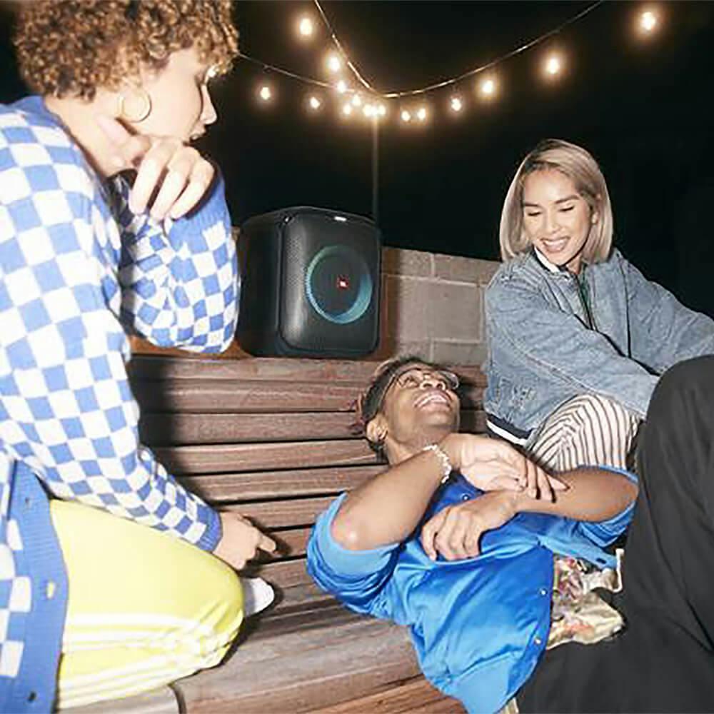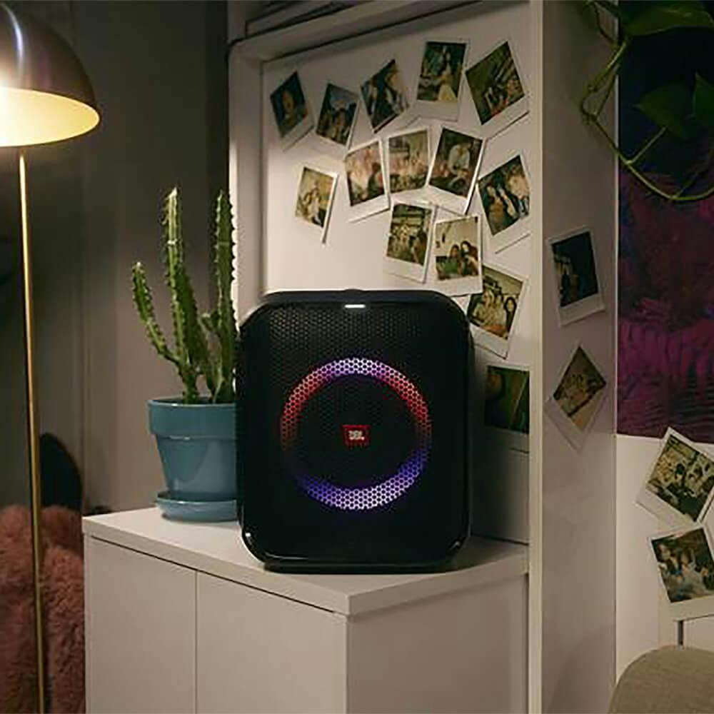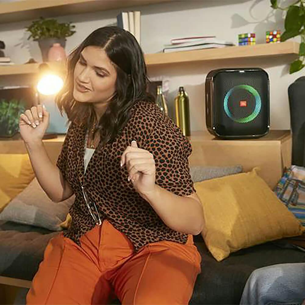 Imagine tucking a music sound system, light display, and karaoke machine under your arm to take to a party. Actually, you can do just that with the JBL PartyBox Encore Essential. This all-in-one speaker has built-in Bluetooth for wireless streaming. Plus, you can plug an optional mic into it for sing-along fun. The built-in light ring on the front syncs to the beat of your tunes.