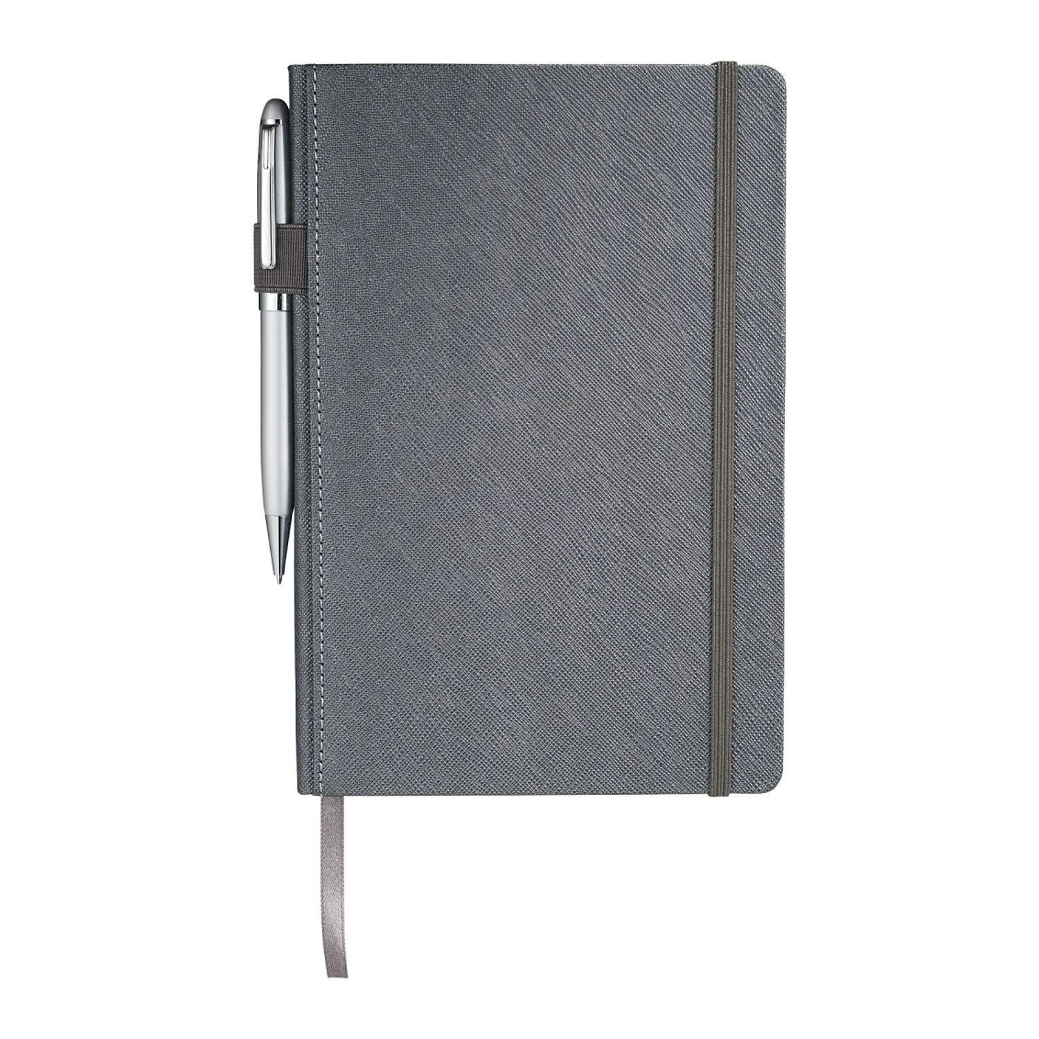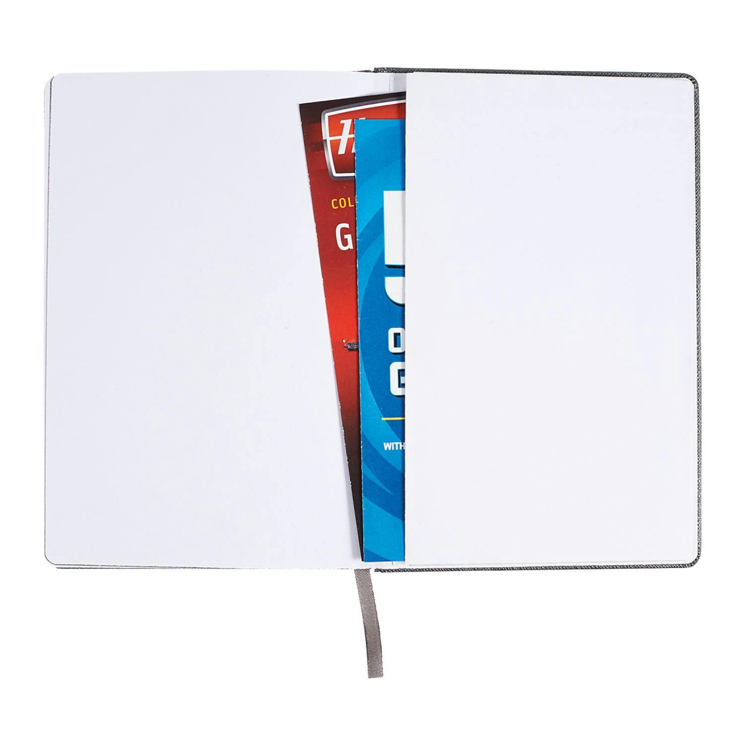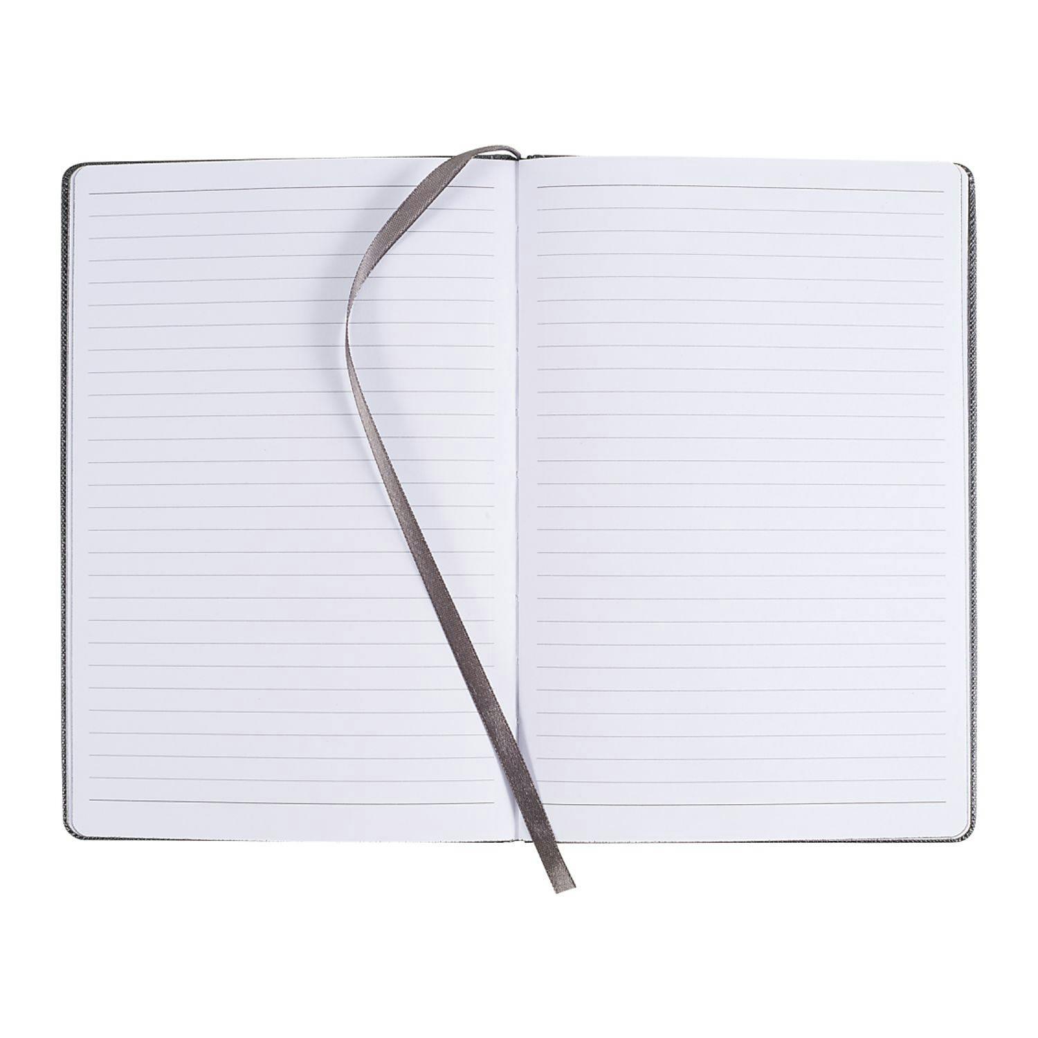 Premium, textured hard cover bound journal. Elastic pen loop on spine. Elastic closure and ribbon page marker. Back document accordion pocket. 96 white lined sheets of paper with color matching painted edges.