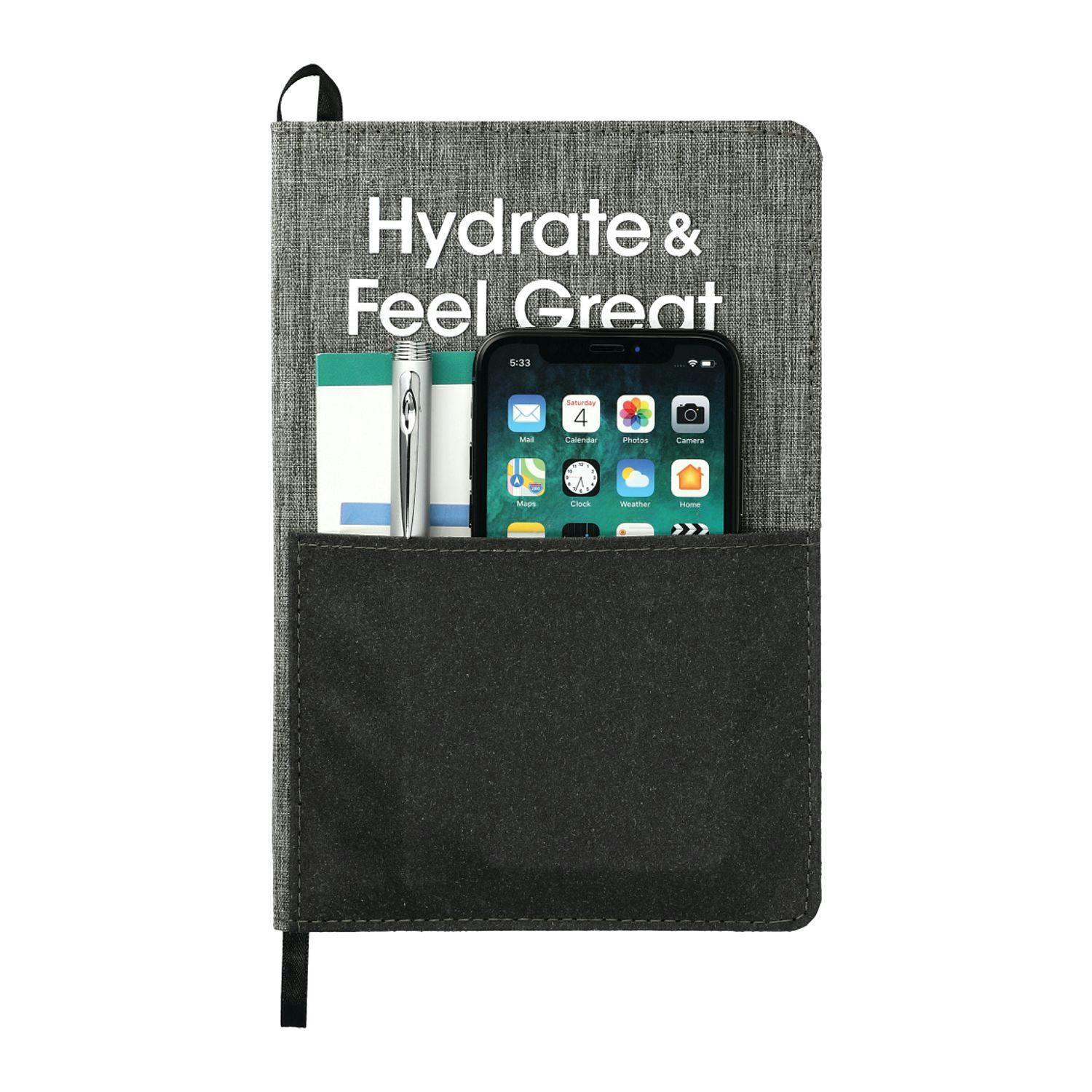 Made of post-consumer recycled fabrics, the 5.5" x 8.5" Reclaim Recycled Bound JournalBook® features an RPET hard cover with recycled leather front pocket for storing documents, smartphones, etc. 80 sheets of recycled white paper. Includes back document pocket. This item contains 85% of recycled material.