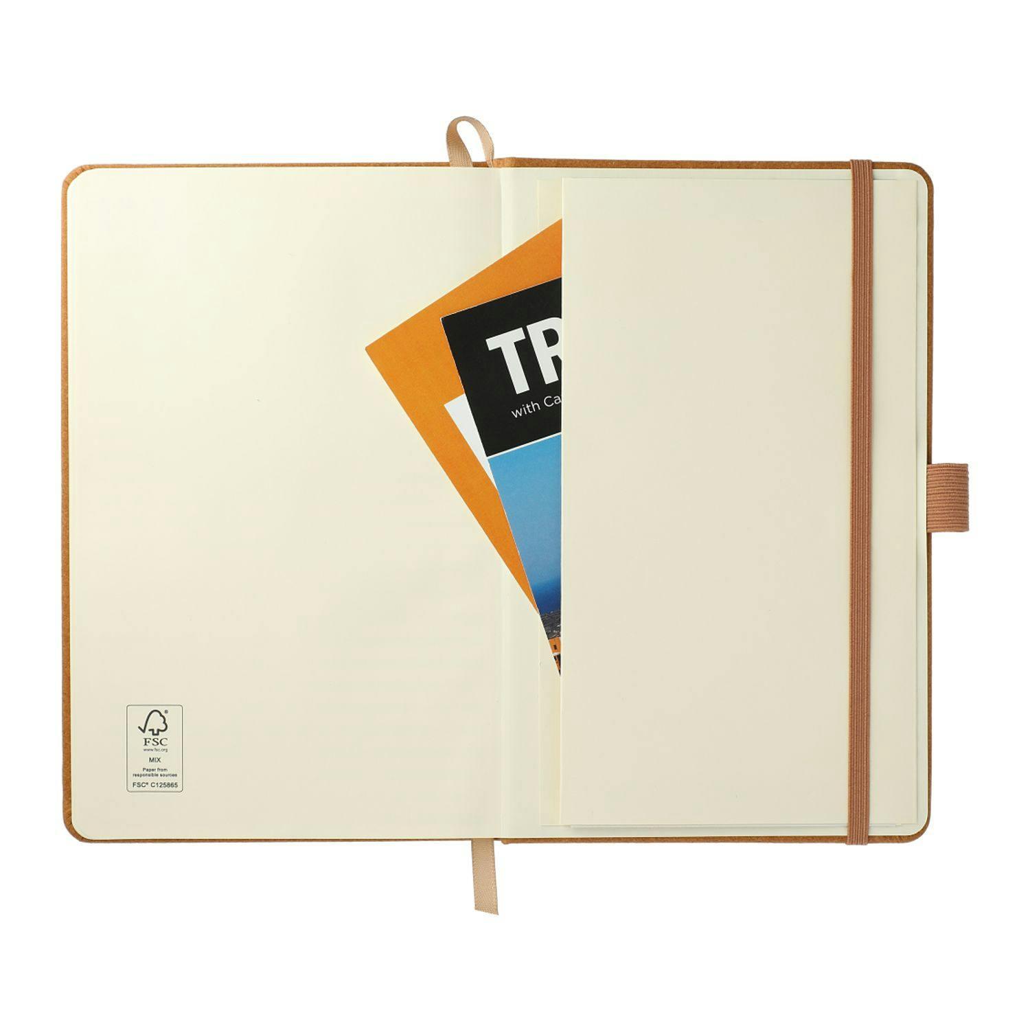 The 5.5" x 8.5" Recycled Leather Bound JournalBook features a recycled leather, hard cover with 80 sheets of cream lined FSC paper. Color matching elastic closure, pen loop, and ribbon page marker. Back document pocket.