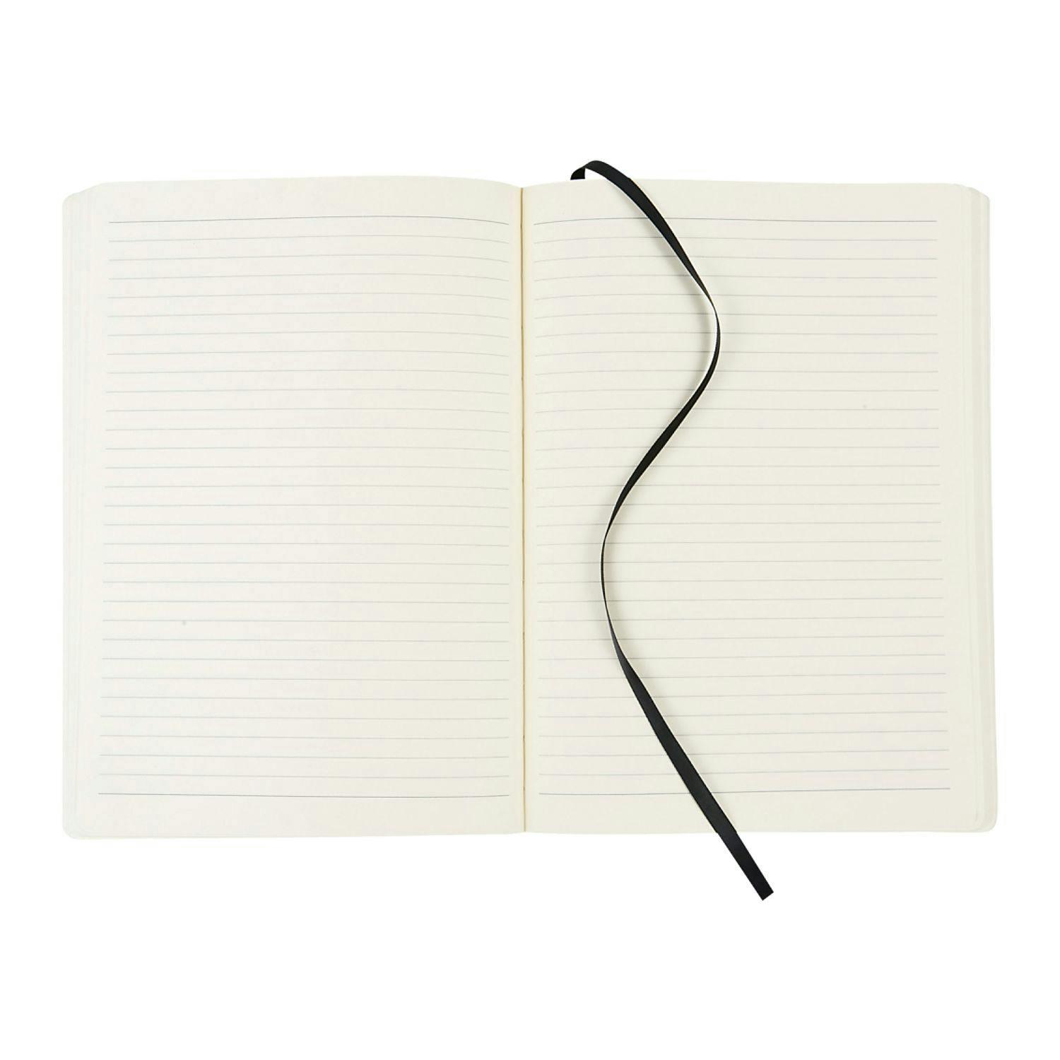 Flexible, soft cover with built in elastic closure. Ribbon page marker. Document pocket on interior back cover. Includes 80 sheets of cream lined paper.