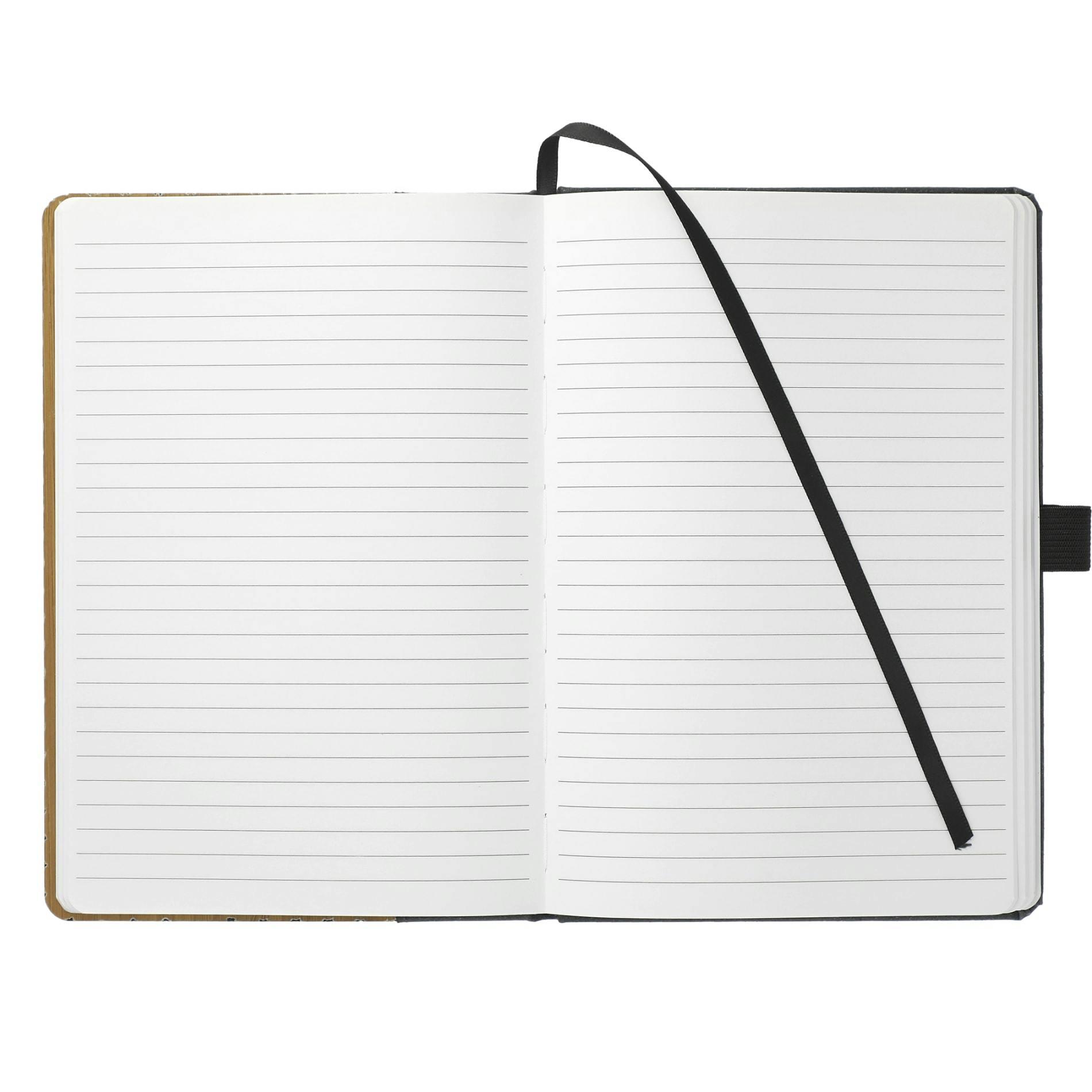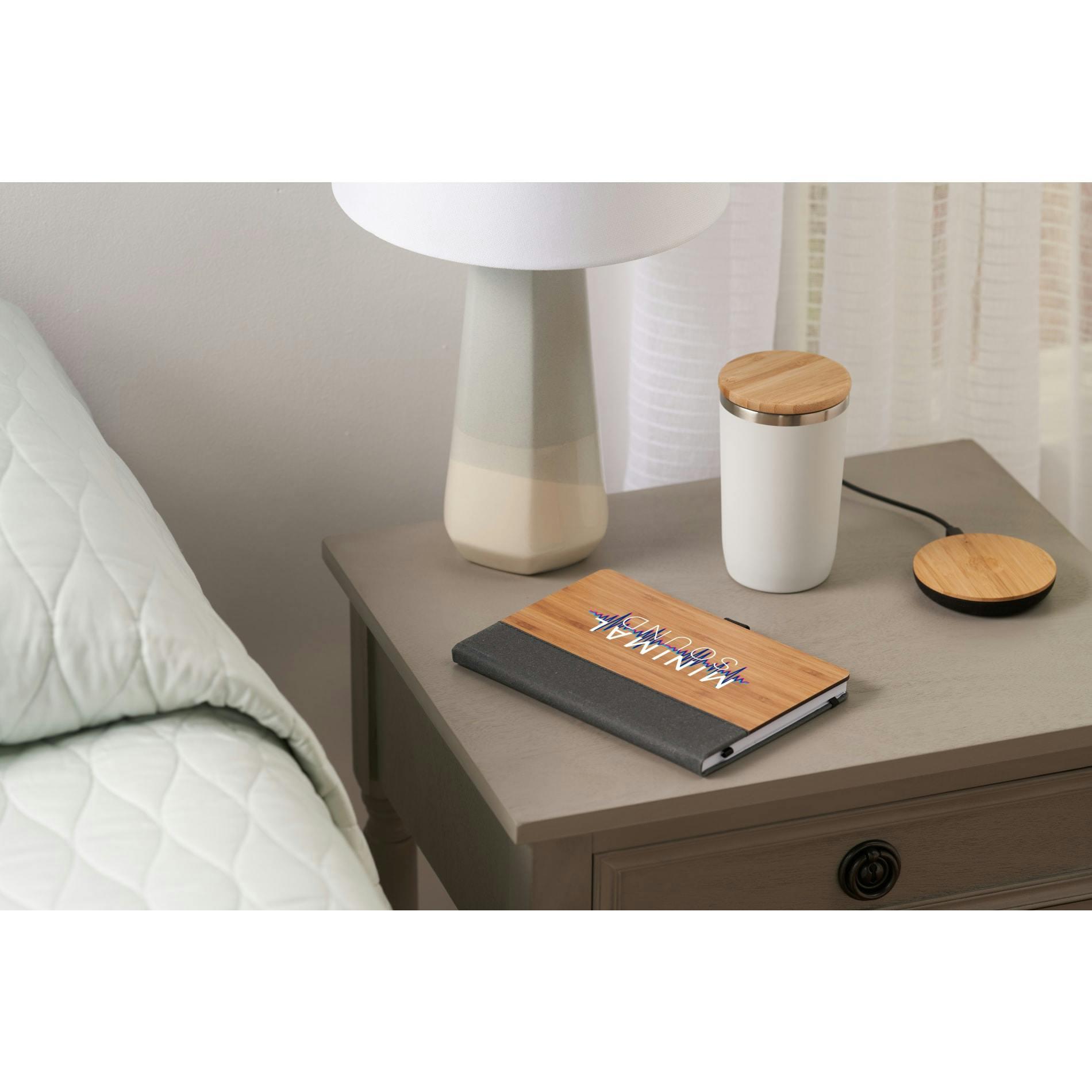 The Bamboo Bound JournalBook is an eco-friendly bamboo-covered notebook with a recycled-leather accent—stylish, durable, and perfect for meetings, travel, journaling, or sustainable promotional gifts. It holds 80 sheets of recycled, white lined paper (5.5" x 8.5") and includes an elastic closure, ribbon page marker and elastic pen loop for everyday convenience. Lightweight and pocket-friendly, this recycled paper notebook keeps notes organized on the go and makes a memorable branded giveaway. Through a partnership with 1% For The Planet, 1% of sales of this and all EcoSmart products supports nonprofits that protect the planet. Natural bamboo grain means color and pattern may vary, ensuring each eco journal is one‑of‑a‑kind.