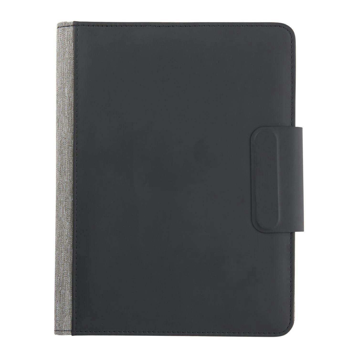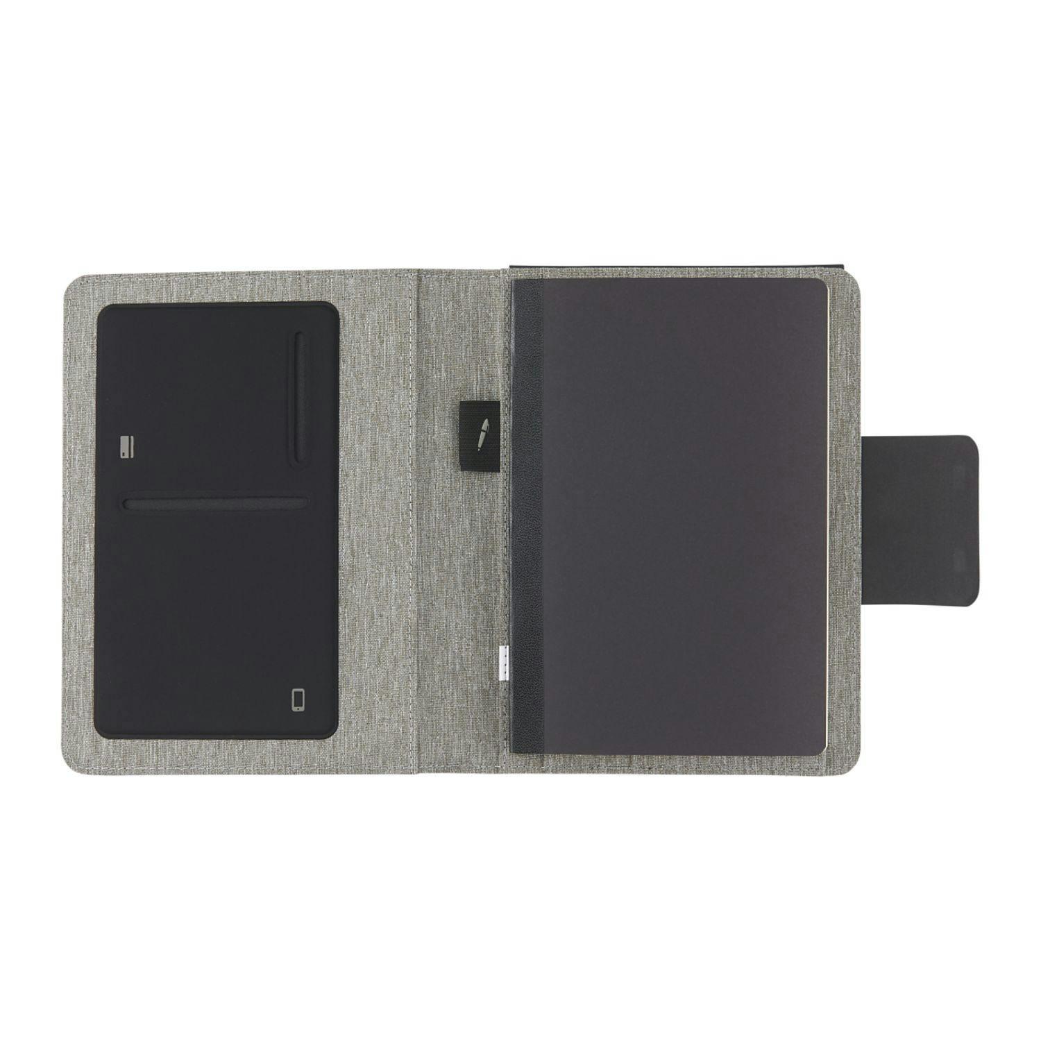 The Reclaim RPET MagClick Fast Wireless JournalBook is made of post-consumer recycled fabrics. This specialty bound notebook features an RPET cover with recycled leather front pocket for storing documents, smartphones, and other essentials. This notebook includes 64 sheets of FSC recycled lined paper. Also includes 15W wireless charger with magnet, 1m TPE charging cable, and interior elastic pen loop.