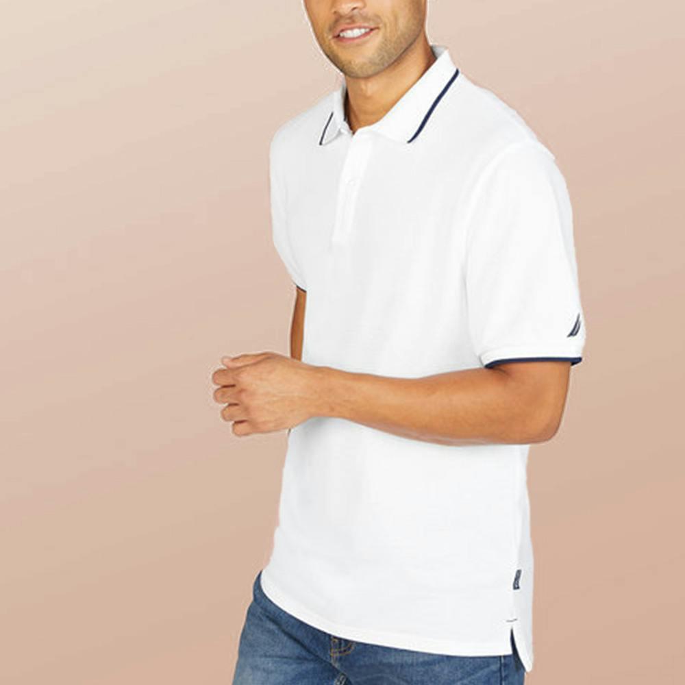 Crafted with a blend of cotton and polyester, this polo offers a comfortable and durable feel. The ribbed collar and cuffs with contrast striped tipping add a touch of style, while the striped neck tape provides a visual accent. The side slit hem allows for ease of movement, while the J-Class logo on the left sleeve and classic Nautica flag label at the left side seam showcase the brand's signature touches. Add a logo and elevate your style with the Nautica Deck Polo.