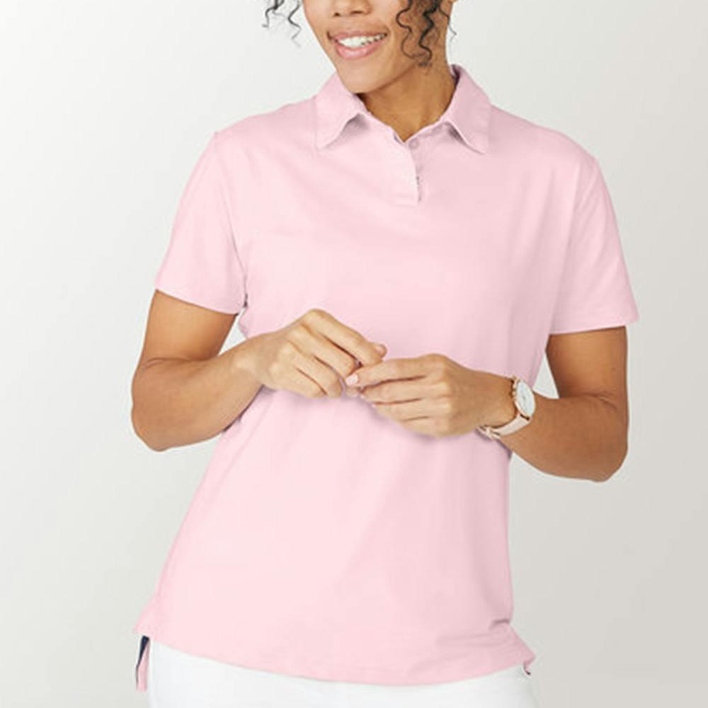 Introducing the Nautica Women's Saltwater Stretch Polo, a perfect blend of style and functionality. Crafted from a high-quality fabric composition of 89% polyester and 11% Spandex, this polo offers a comfortable and stretchy fit. With a 40+ UV protection feature, it provides added defense against harmful sun rays. The two-button hidden placket, accompanied by stripe tape detail, adds a stylish touch to the design, while the Nautica branded rubber buttons ensure durability. The polo features a micro locker loop for easy hanging, a contrast interior facing for visual interest, and side vents for breathability. All that's missing now is your logo!
