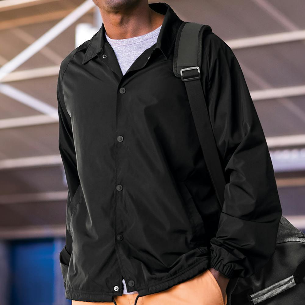 This New Era Coaches Jacket is a modern take on the classic coaches jacket, featuring polyester with a durable water-repellent (DWR) finish. Enjoy tag-free comfort with the heat transfer label, while matte black silicone-embossed New Era flag logo snaps add a sleek touch. The jersey-lined front pockets, elastic binding at cuffs, and round, dyed-to-match drawcords at the hem with matte black tips provide both functionality and style. The debossed silicone New Era flag logo at the hem completes the look of this street-ready, revamped coaches jacket. Create your very own using artwork or a design!