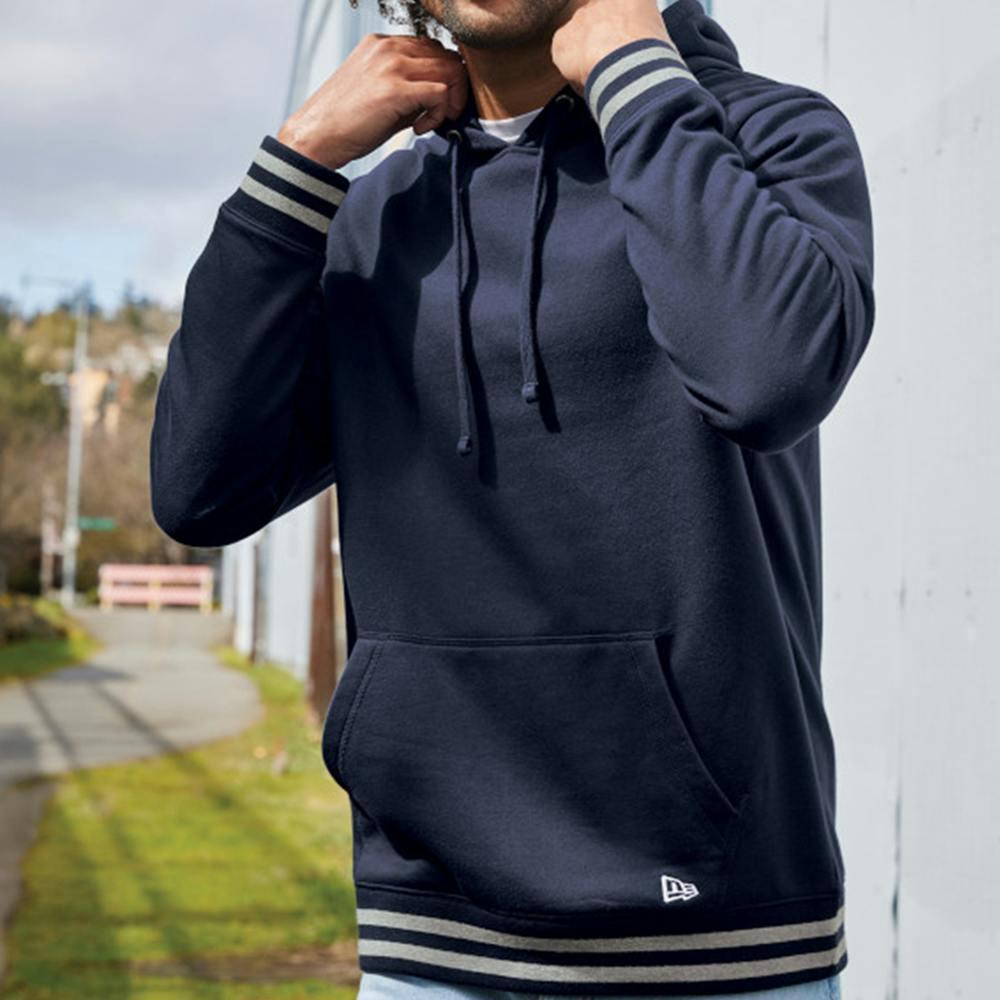 The New Era Comeback Fleece Pullover Hoodie, a perfect blend of classic styling and New Era attitude. Crafted from ring-spun cotton and polyester, this hoodie offers a soft midweight feel. The 2-panel hood, coverstitching at the hood, cuffs, and hem, along with dyed-to-match drawcords and brushed nickel metal eyelets, provide a stylish touch. Stay cozy with the rib-knit cuffs and hem, and keep your essentials close in the front pouch pocket. The hoodie is finished with an embroidered New Era flag at the left pocket, making it a standout choice for any occasion. Create your very own using a logo or design!