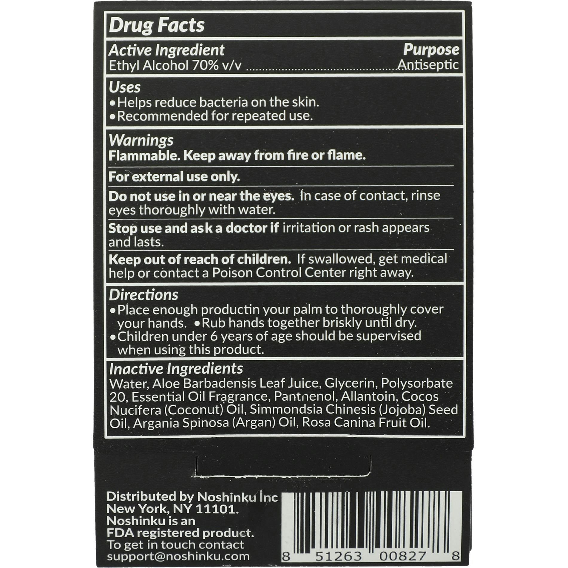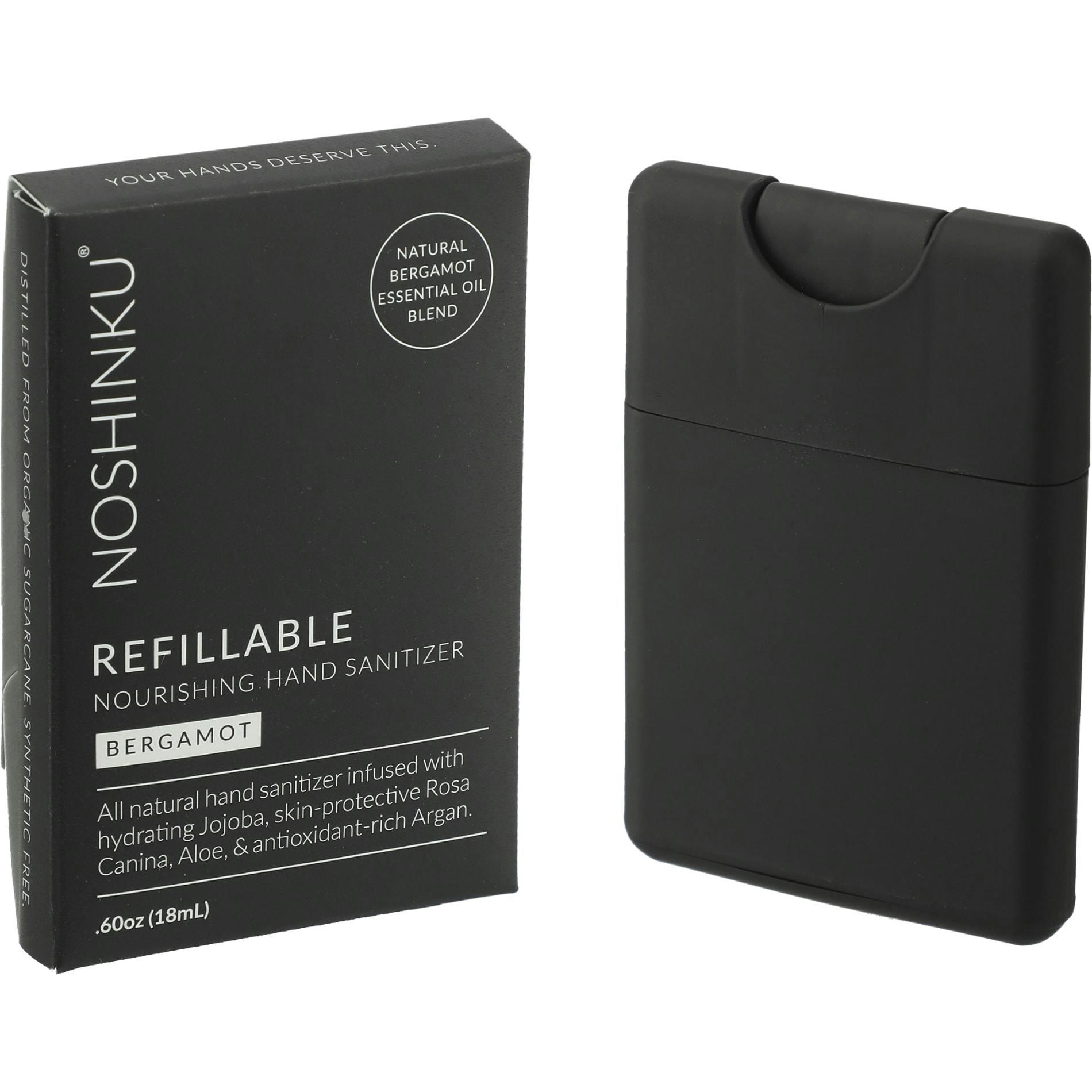 The 0.6oz Noshinku Refillable Pocket Hand Sanitizer features a hydrating and nourishing sanitizer blended with 70% pharma-grade ethyl alcohol distilled from organic cane sugar alongside a conditioning blend of Aloe, Rosa Canina, Jojoba, and Argan to soothe, moisturize and protect skin. Noshinku sanitizer is an FDA-Registered and Compliant Formula. Each sprayer contains approximately 270 sprays and can be refilled. Made in the USA. Scents: BK (Bergamot), BL (Vetiver), GR (Eucalyptus), LV (Lavender) and OR (Spice).