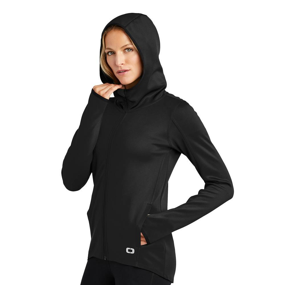 The OGIO Endurance Women's Stealth Full-Zip Hoodie is a lightweight (8.6 oz) performance hoodie that pairs sleek styling with technical function—95% polyester/5% spandex and stay-cool wicking keep you dry and comfortable. A ventilating perforation on the center back increases airflow for workouts, while reflective O Endurance accents boost low-light visibility; thumbholes, mesh-lined front pockets, chin-guard zipper and tag-free heat-transfer label add everyday comfort. Ideal for running, training, the gym or casual wear—and imprint-ready for custom logos—this hoodie makes a smart promotional choice. Please note: available to ship within the United States only.