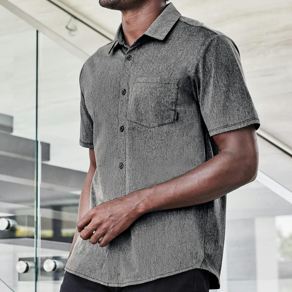 Extend your casual wardrobe with this OGIO knit shirt that has mechanical stretch. The heathered fabric has a subtle pinstripe effect that’s evident in the inside collar, locker loop and at the side seam gussets.