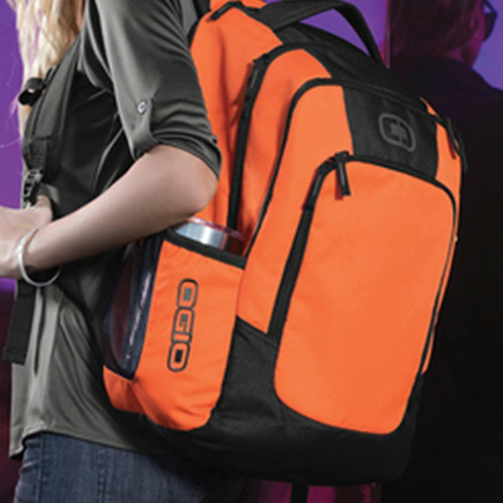 The OGIO Logan Backpack — a durable, feature-packed laptop backpack built for students, commuters and frequent travelers. Constructed from 840D poly dobby with PU backing, it protects most 15" laptops in a padded sleeve and keeps tablets, chargers and everyday gear neatly organized with a roomy main compartment, large secondary pocket, front organization panel and dual side mesh water bottle holders. Ergonomic padded straps and a moisture-wicking air-mesh back panel deliver all-day comfort, while a 1,700 cu.in. capacity and sturdy details make it travel-ready. Add your logo for a standout promotional backpack — ships within the United States only.