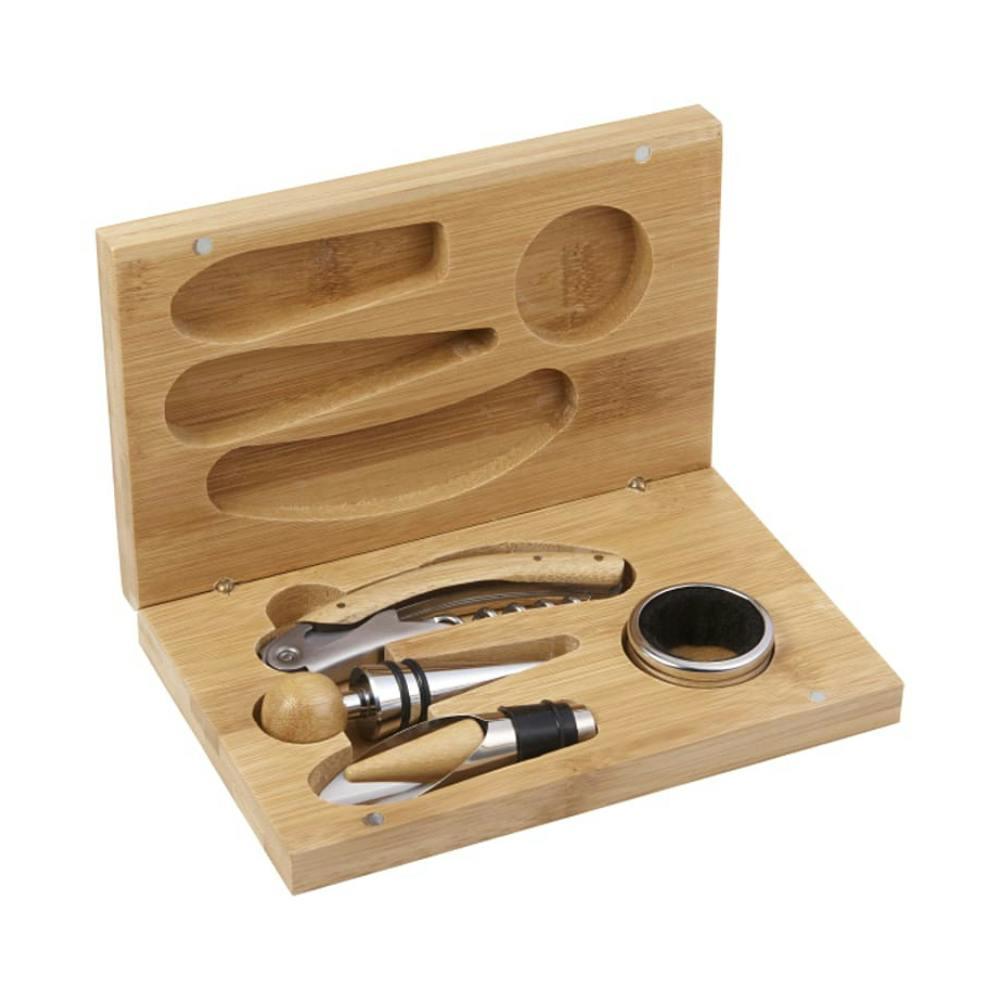 The 4 Piece Bamboo Wine Gift Set is a classic gift set perfect for any occasion. The bamboo accented pieces included are a wine stopper, foil cutter, bottle opener, and pourer. FDA tested. Due to the nature of the bamboo material, variations in laser imprinting quality may occur.