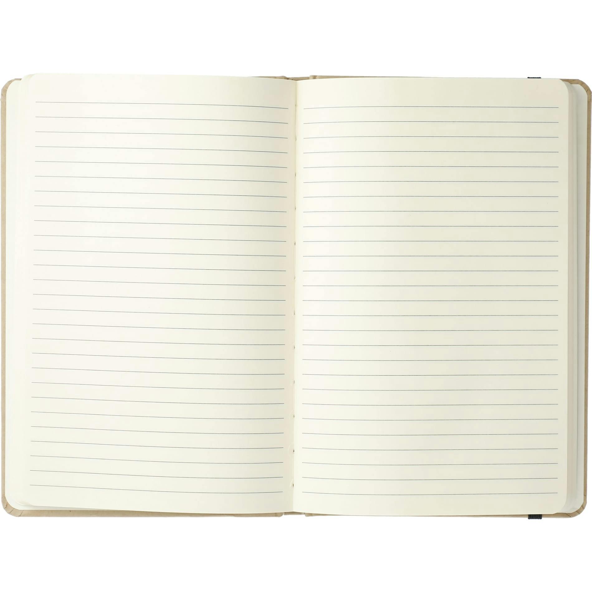 The 5.5" x 8.5" Snap Large Eco Notebook is a recycled cardboard notebook that includes 80 cream ruled pages with a secure elastic closure. Due to the nature of the material, there may be color variances.