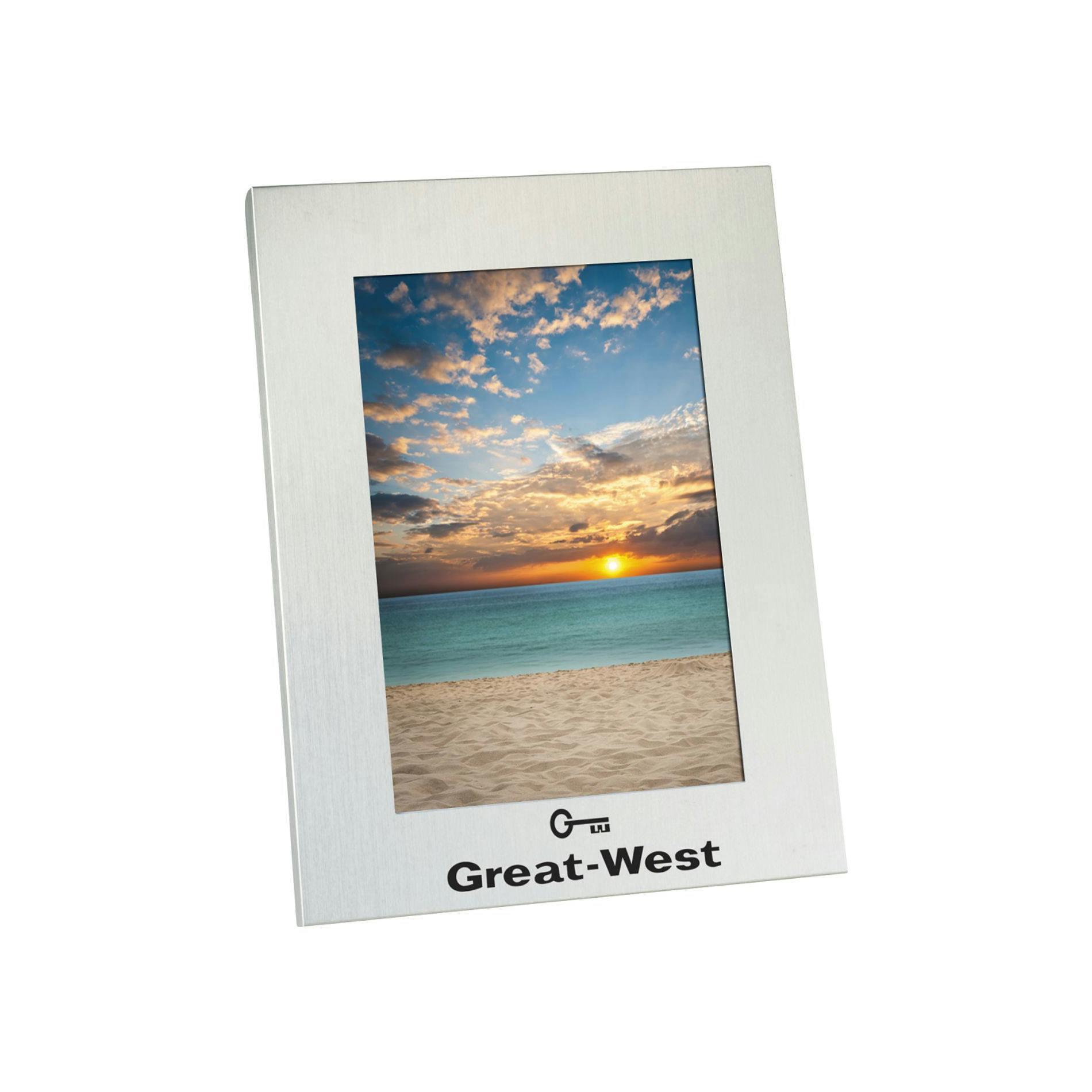 a custom 5" x 7" Aluminum Picture Frame offers a sleek and modern way to showcase memories while keeping your brand in focus. Made from durable aluminum, this frame securely holds a 5" x 7" photo and is perfect for desks, shelves, or wall displays. Its clean design makes it a timeless addition to any home or office. Customize it with your logo to create a branded picture frame that keeps your business in the spotlight with every glance.