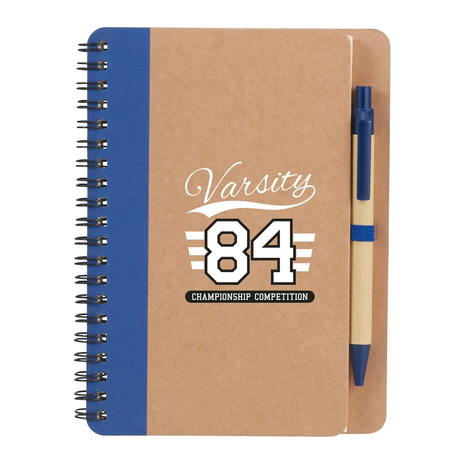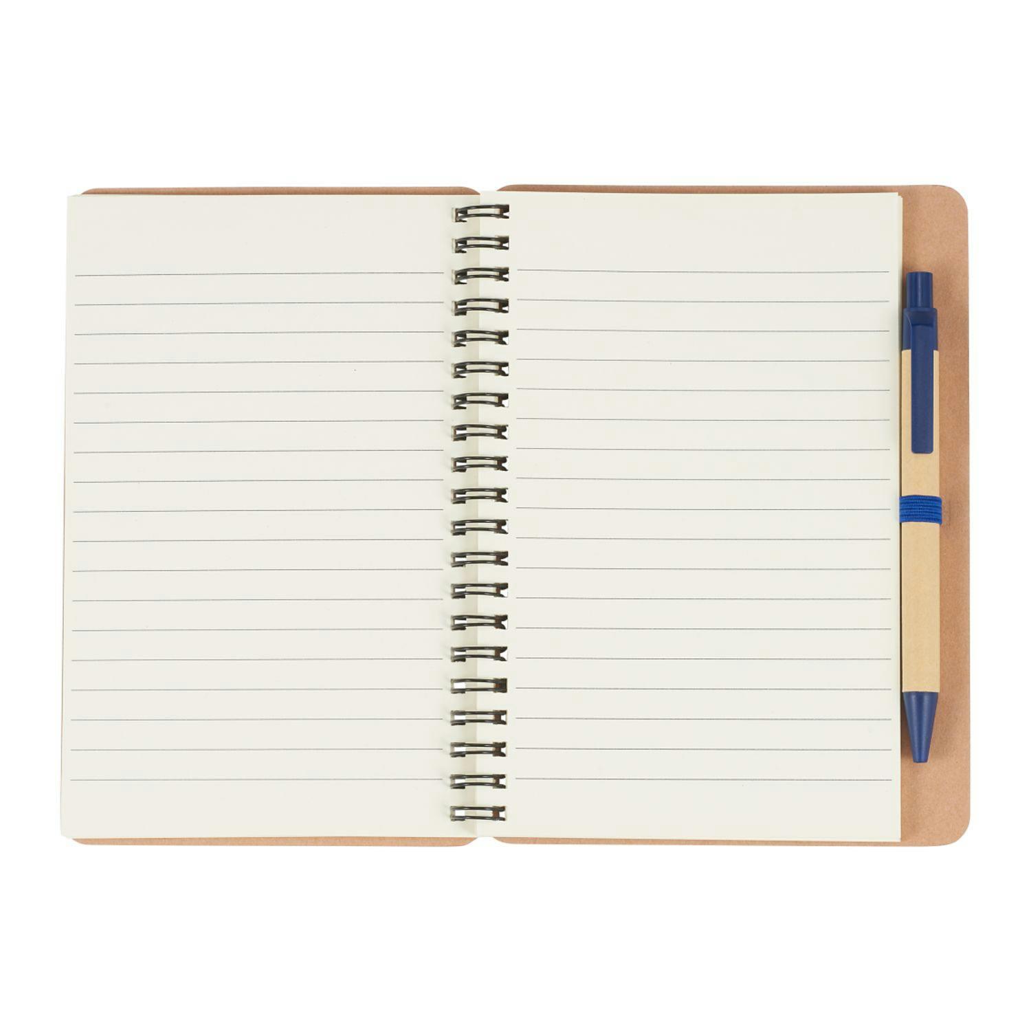 The 5" x 7" Eco Spiral Notebook with Pen features 60 cream ruled pages, a matching color elastic pen loop, and a matching ballpoint pen. Hardcover. A pen imprint is not available and all pens are packed separately. Due to the nature of the material, there may be color variances.