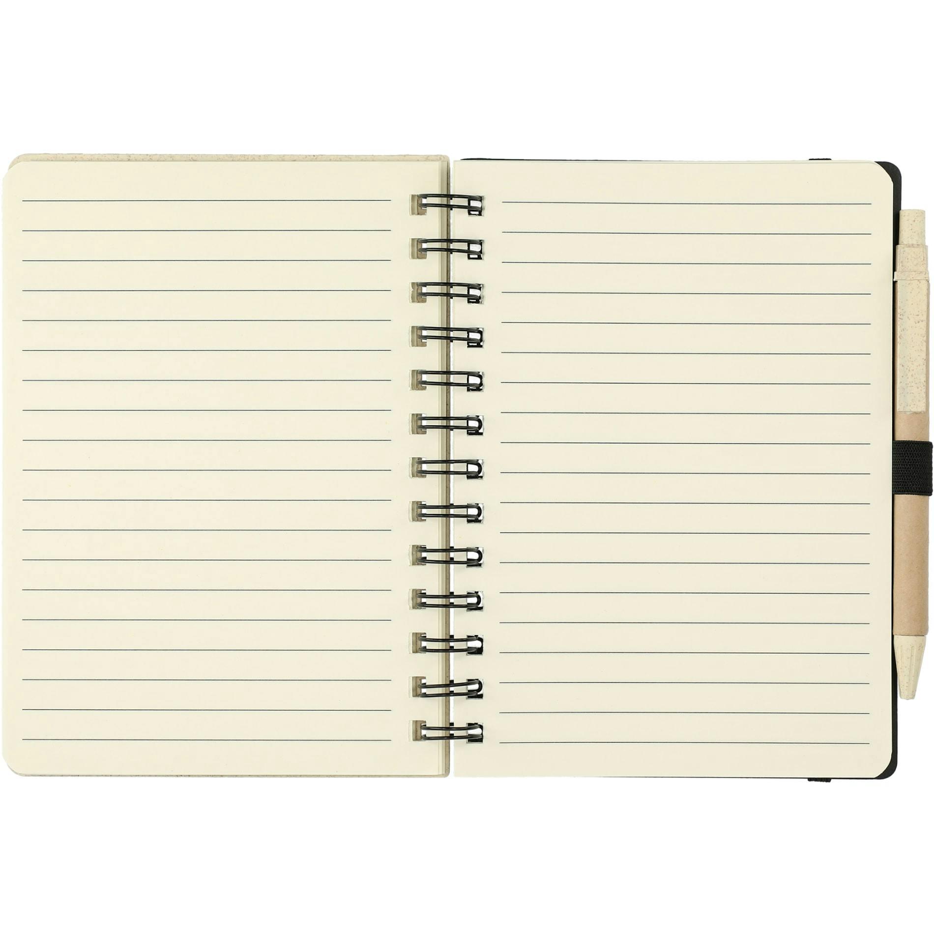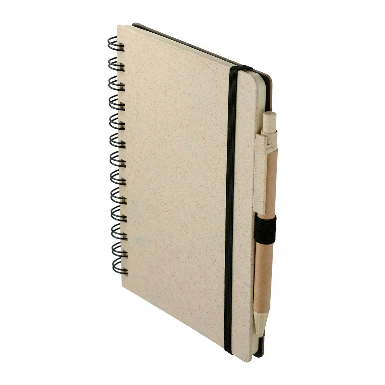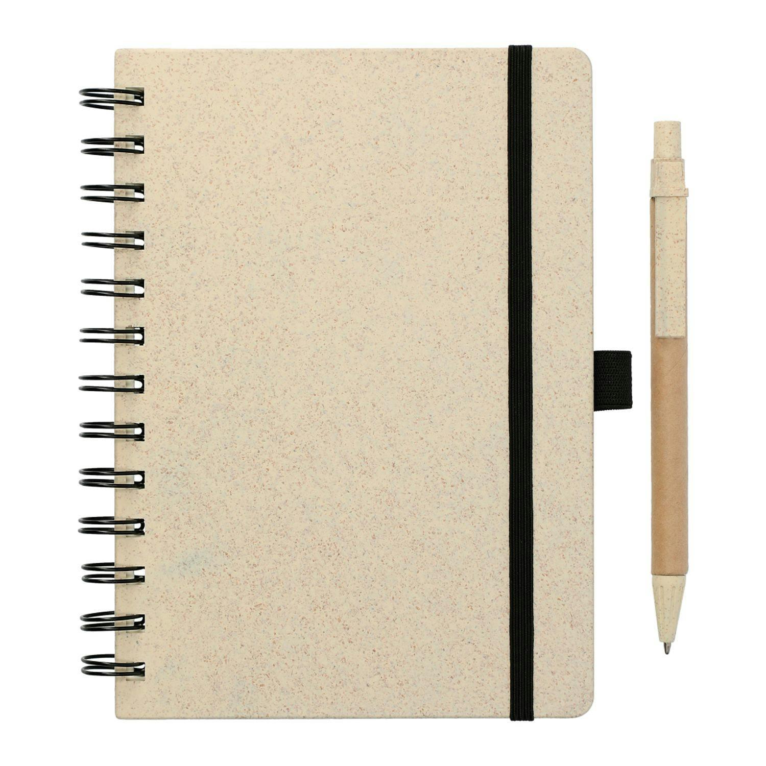 The 5" x 7" Wheat Straw Notebook With Pen features a 51% wheat straw hardcover. Black elastic closure and pen loop. 70 sheets of cream, recycled lined paper. Wheat straw color matching pen with black ink cartridge.