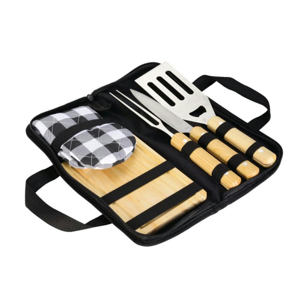 Five-piece BBQ set includes spatula with built-in bottle opener, fork, and knife (all with wooden handles), matching wooden cutting board, and a black and white plaid grilling mitt. All neatly stored in a zippered carrying case.
