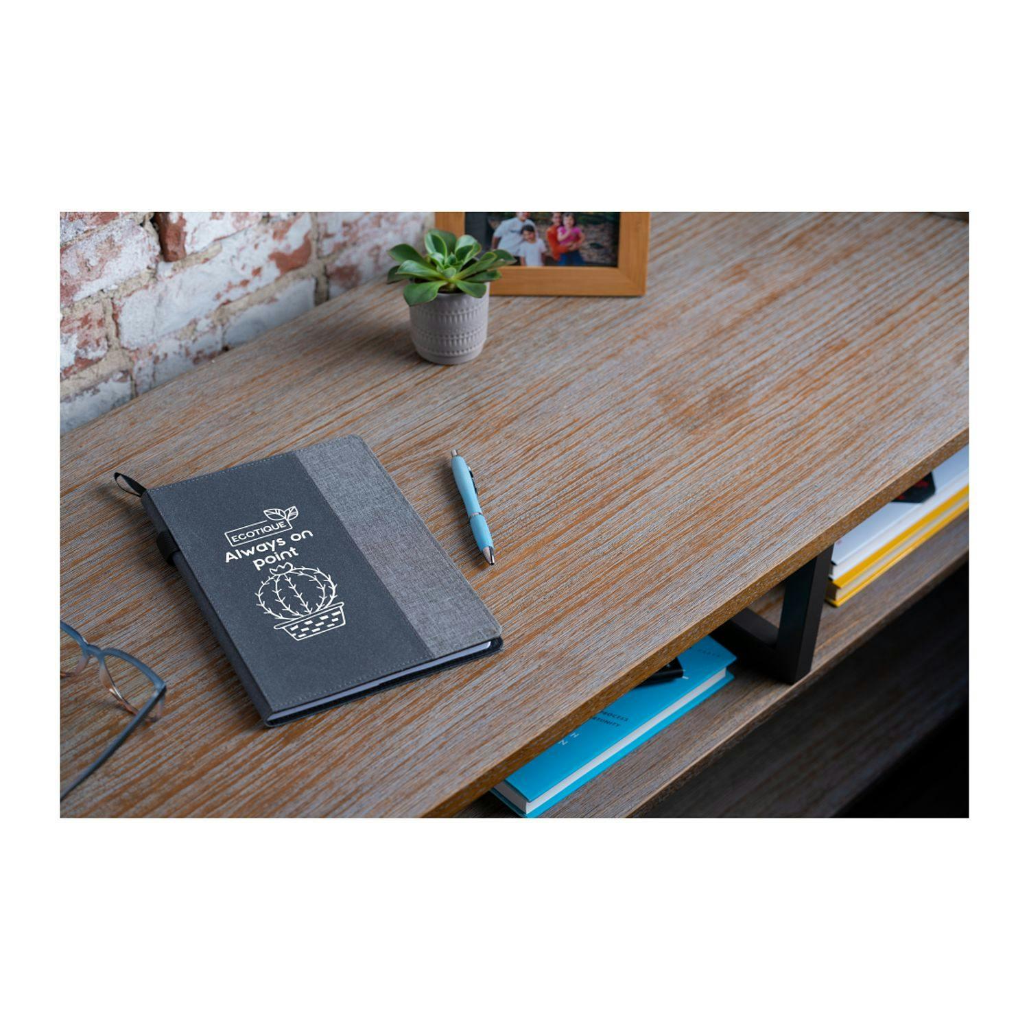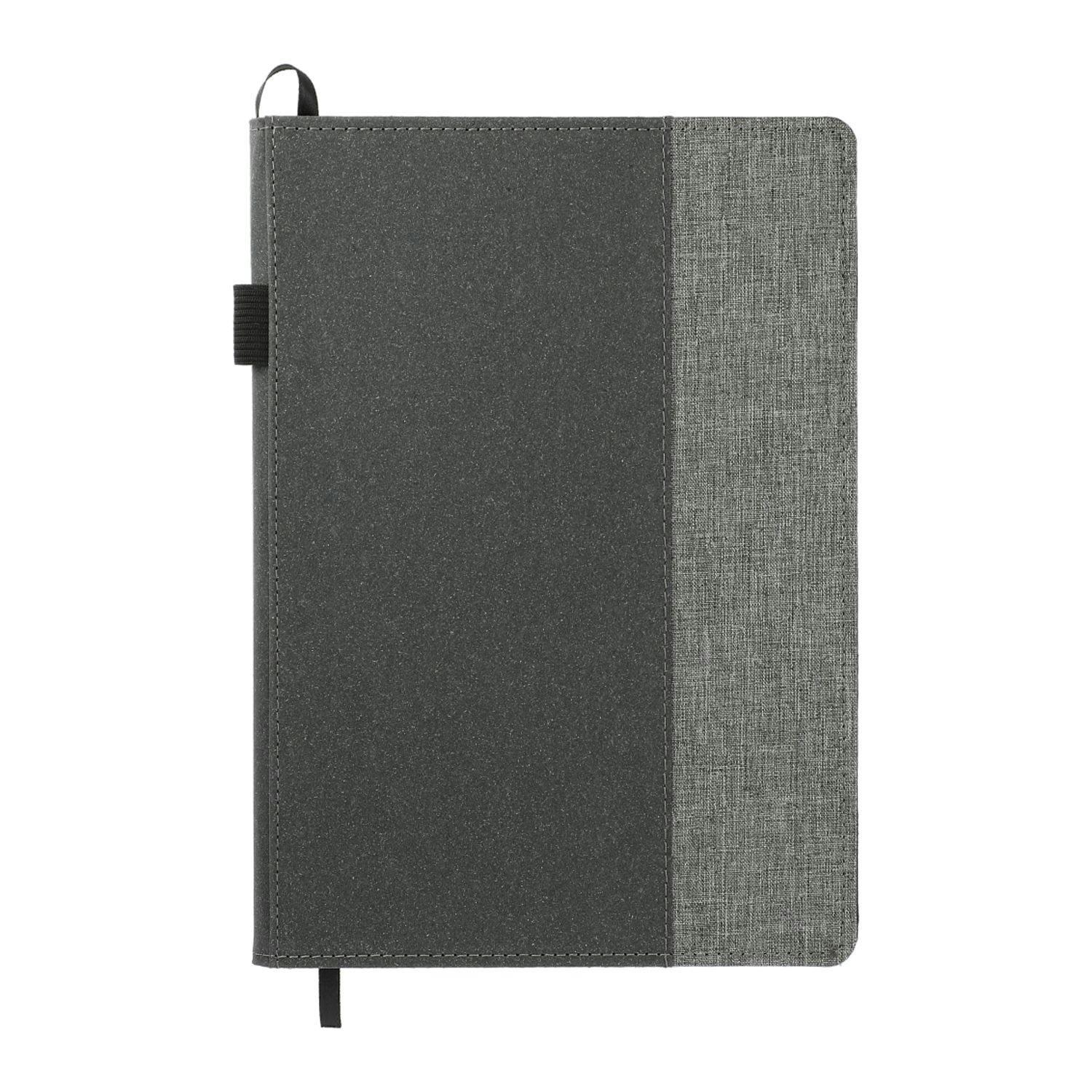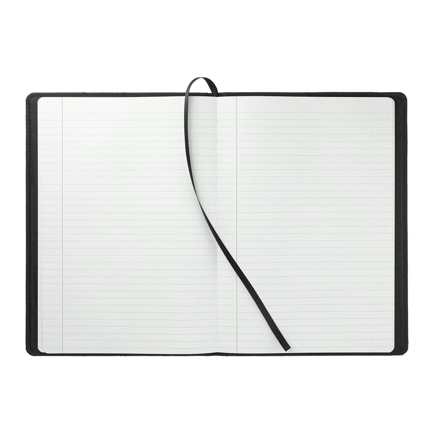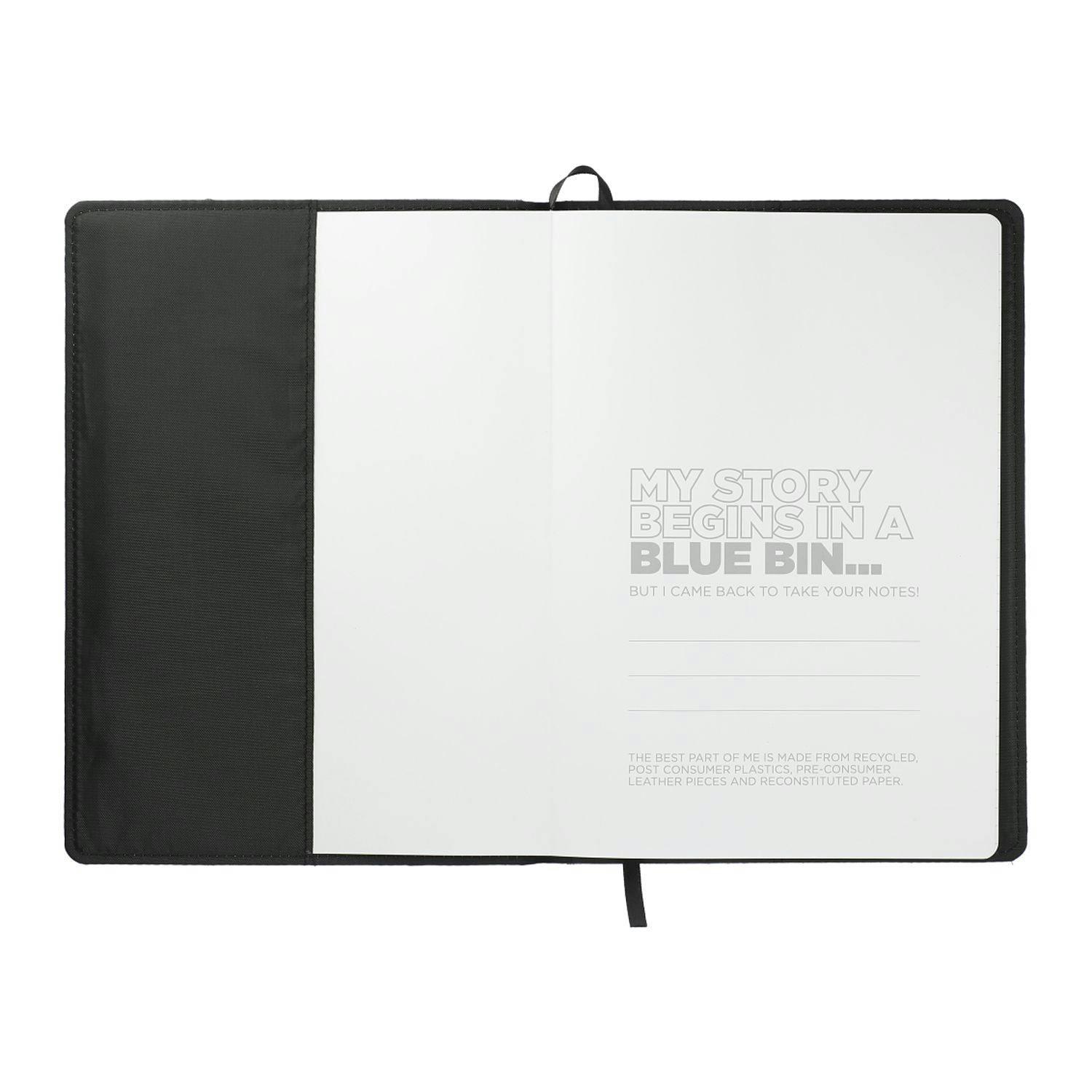 The 7" x 10" Reclaim RPET Refillable JournalBook® is the perfect journal for all of your notetaking needs. Featuring an RPET and recycled leather hard cover, 6" x 9" refill of 80 sheets of white recycled lined paper, ribbon page marker elastic pen loop the spine.