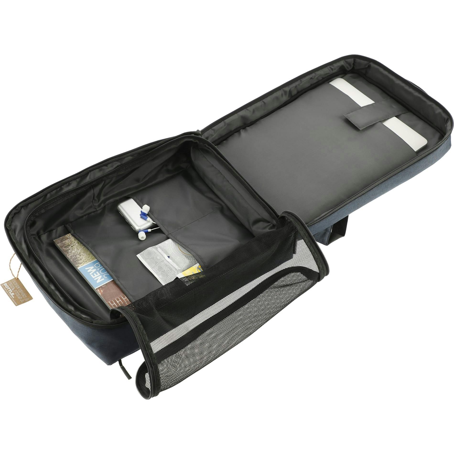 The AFT Recycled 15” Computer Backpack is sure to be your new go-to bag. This backpack features a zippered main compartment with a padded laptop sleep. In the main compartment, you’ll also find a large zippered mesh pocket perfect for storing clothes for an overnight trip. The front of this backpack also features vertical 2 zippered pockets. One pocket features ample storage and organization while the other is a PEVA lined water bottle pocket. There’s also a smaller front zippered pocket for easy access to your essentials. This backpack is made from recycled water bottles.