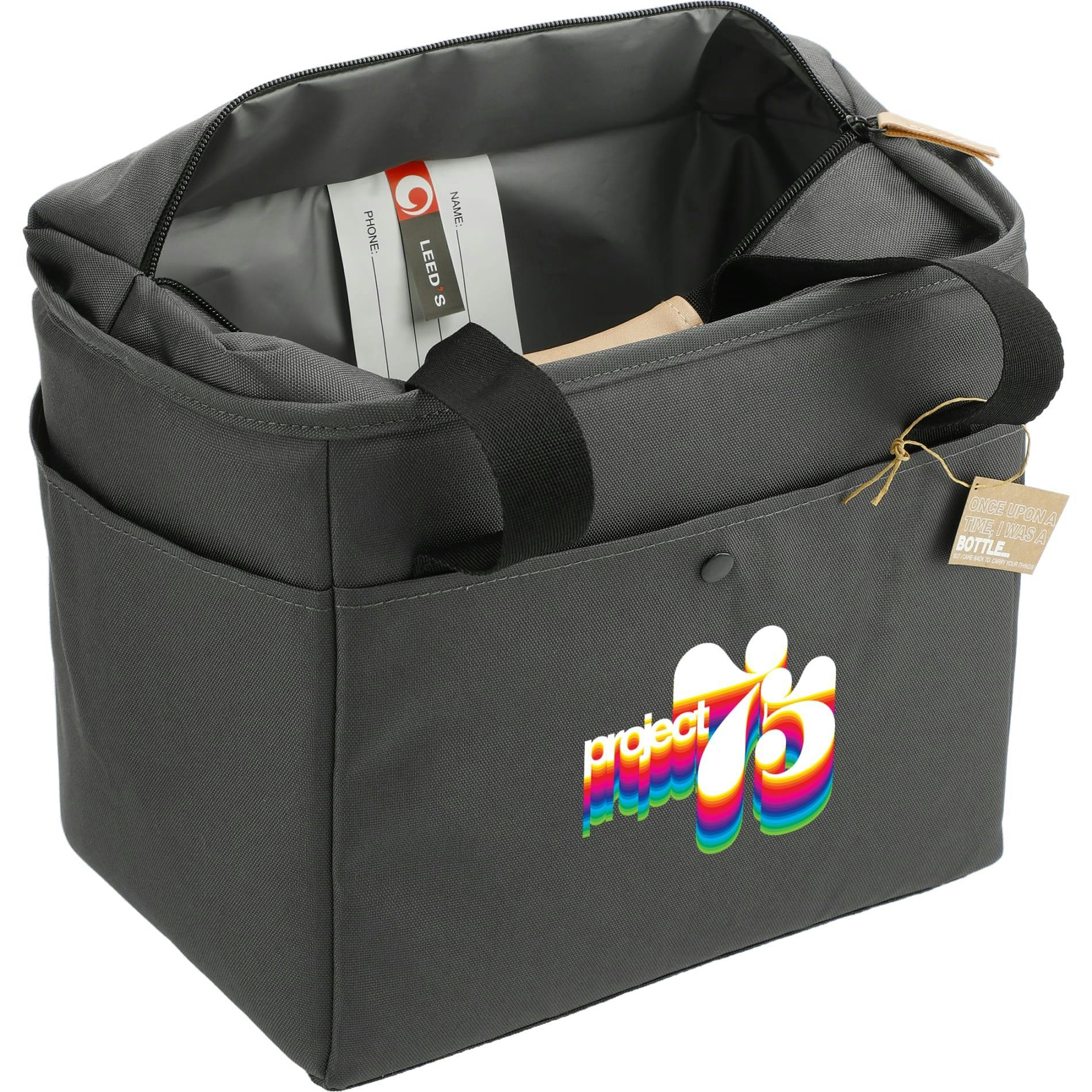 The Aft Recycled rPET Cooler is a great size for carrying all your lunch needs. Features an easy access front snap pocket and two side pockets. Fully insulated inside compartment with zipper closure.