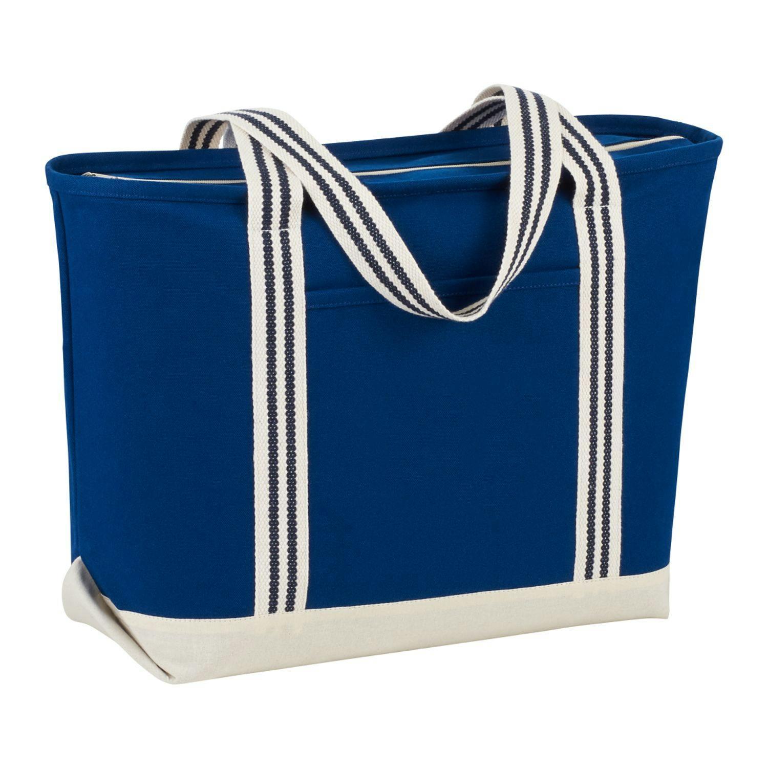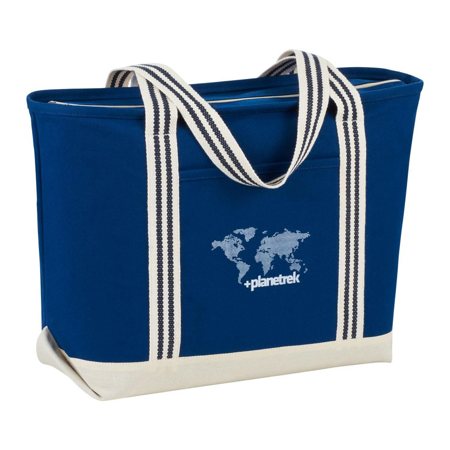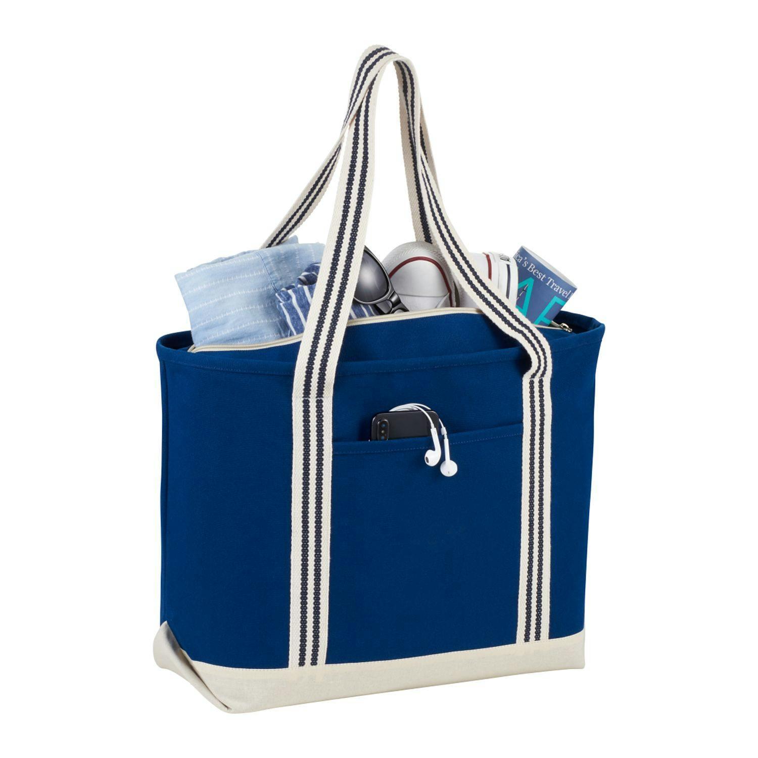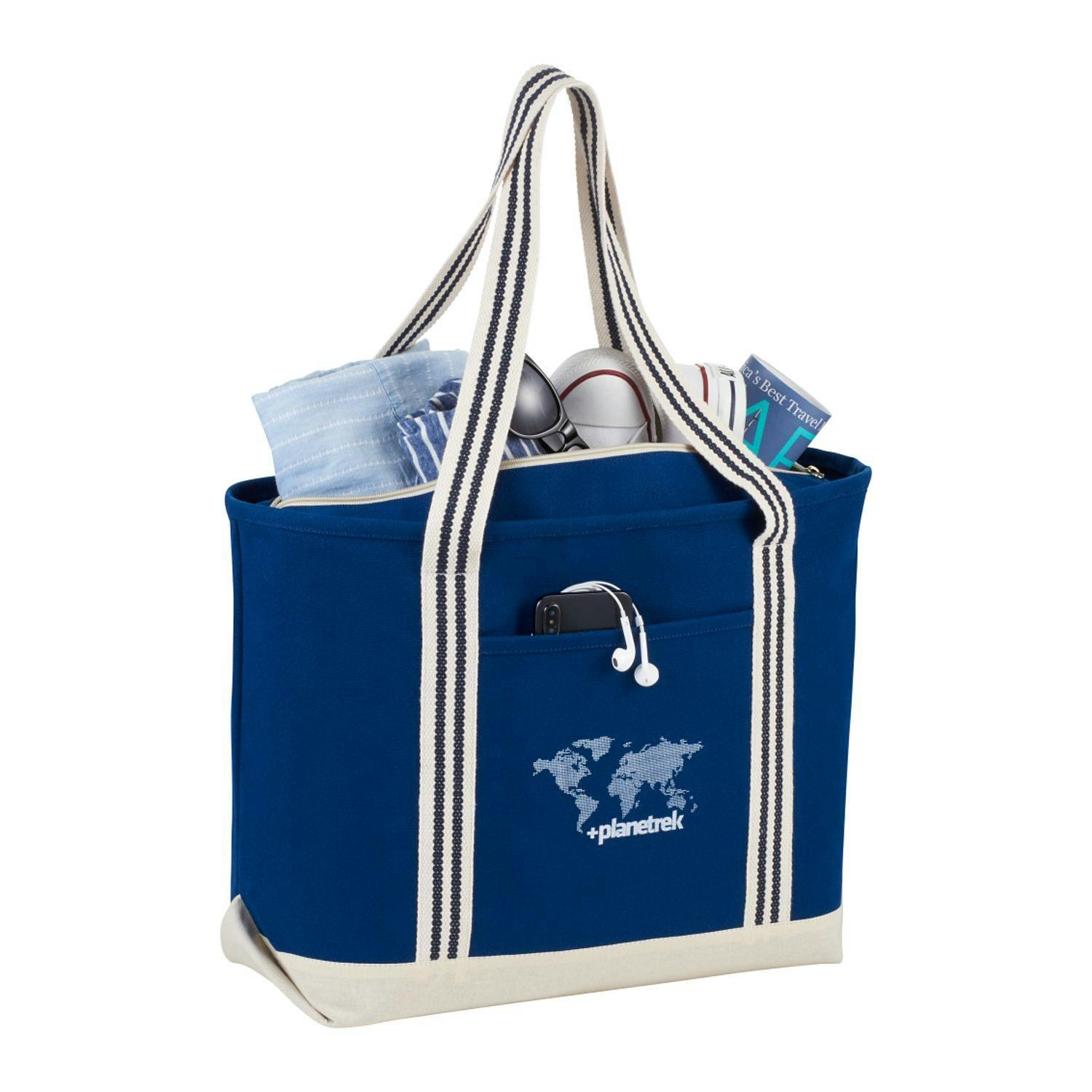 The Large Heavyweight Cotton Striped Zippered Tote Bag is made from durable all-natural cotton canvas material and features a zippered main compartment and an open front pocket.