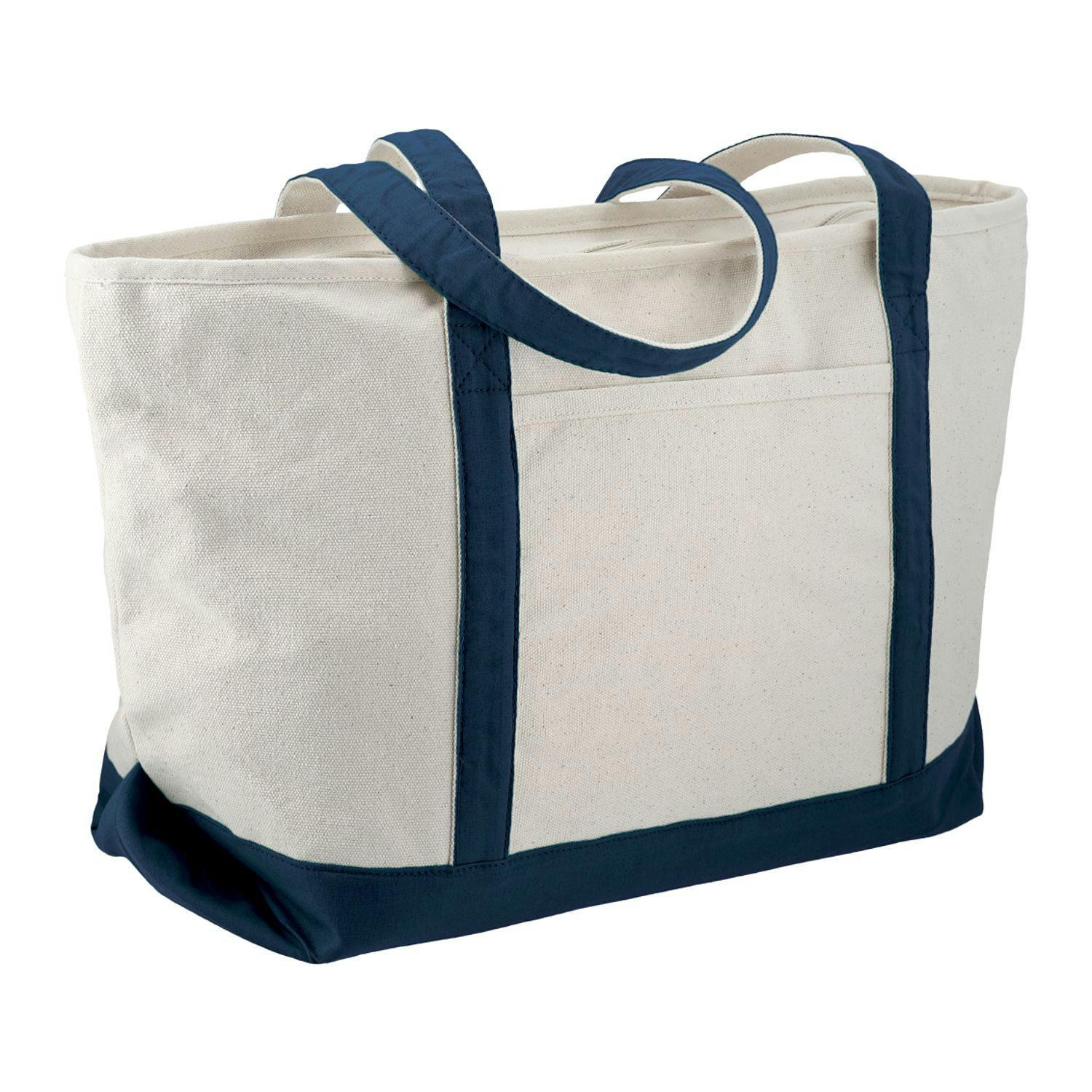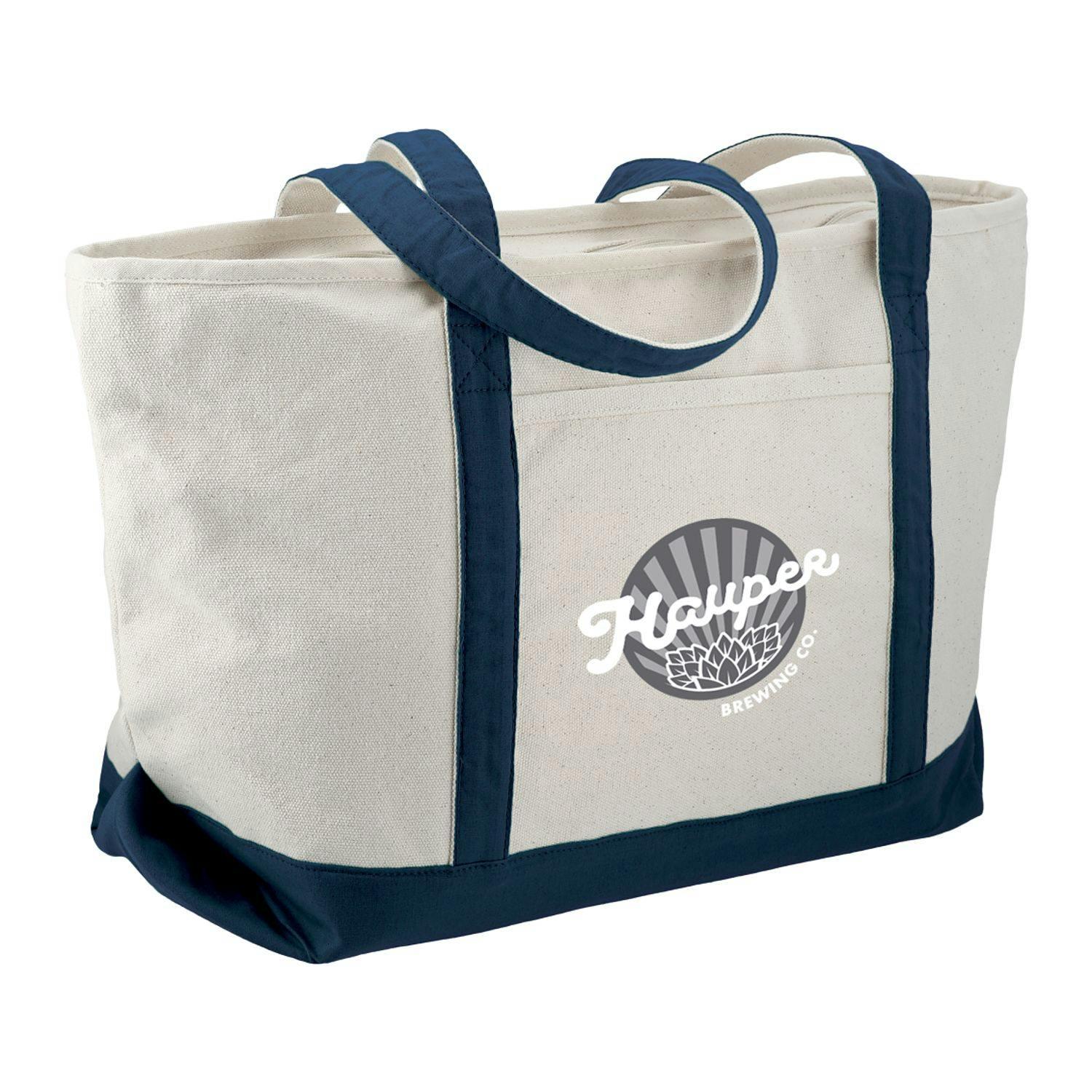 Great for outdoor events and travel. Classic wide boat tote shape in heavy weight and sturdy material. Zippered main compartment. Open front pocket. 12" handle drop height. Disclaimer: There may be minor variations in color of the actual product due to the nature of the fabric dyes, weaves and printing.