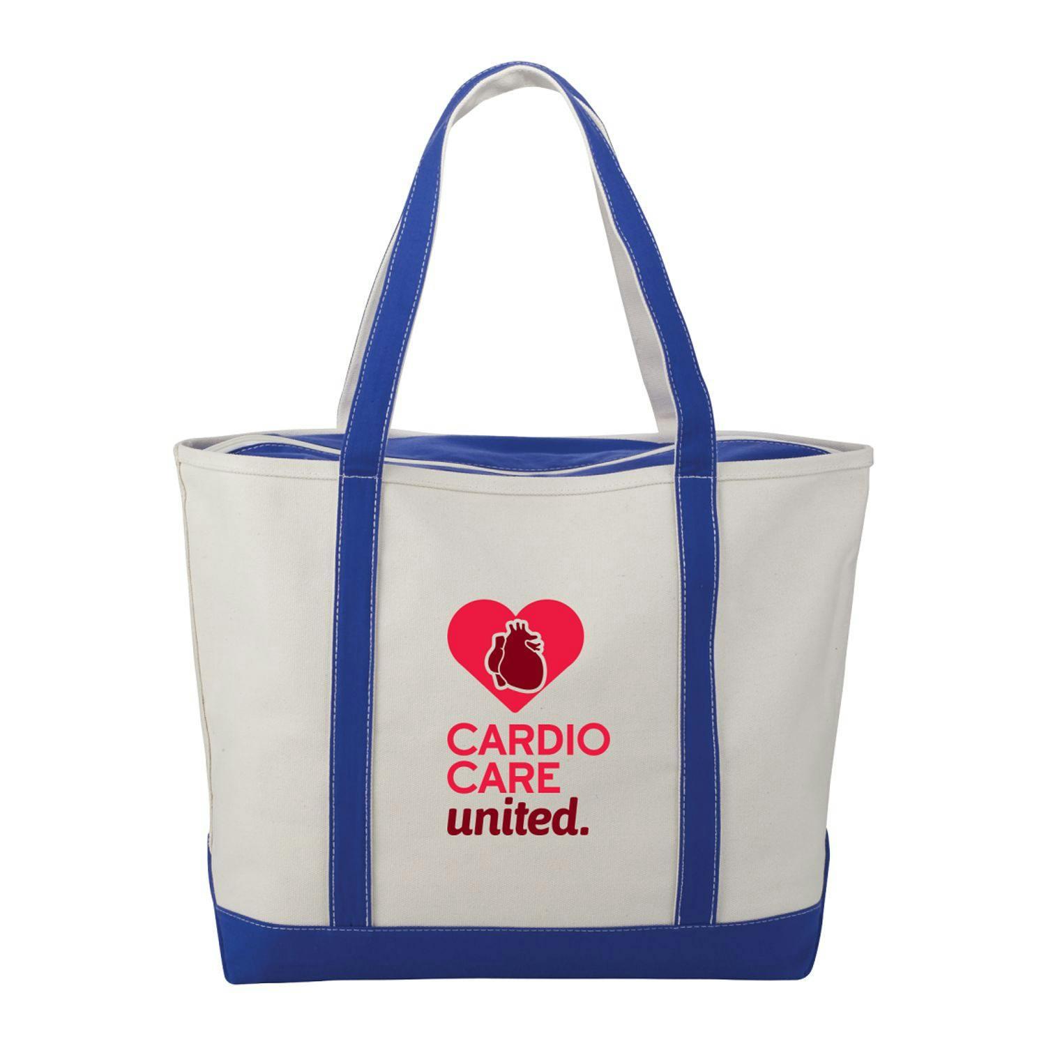 Large Heavyweight Cotton Canvas Zippered Tote — Made from premium bleached cotton, this classic boat-style tote is built for travel, outdoor events, trade shows and everyday errands. Zippered main compartment keeps belongings secure, plus an open interior pocket for phone/keys and 11" drop handles for comfortable over-shoulder carry. Roomy 23" W x 15" H x 7" D capacity, reusable and available in multiple colors — a durable, customizable promotional tote bag ideal for giveaways and retail.